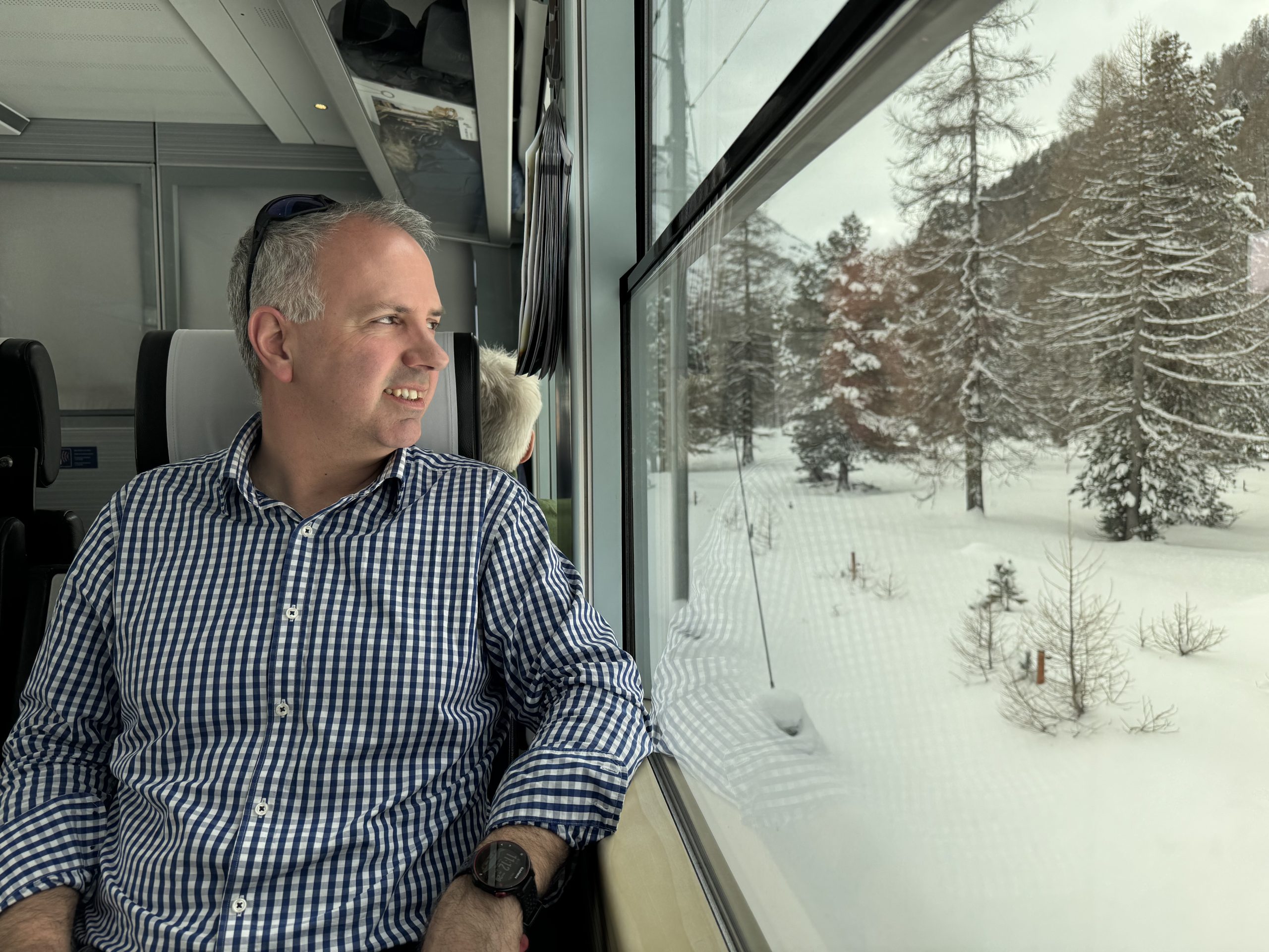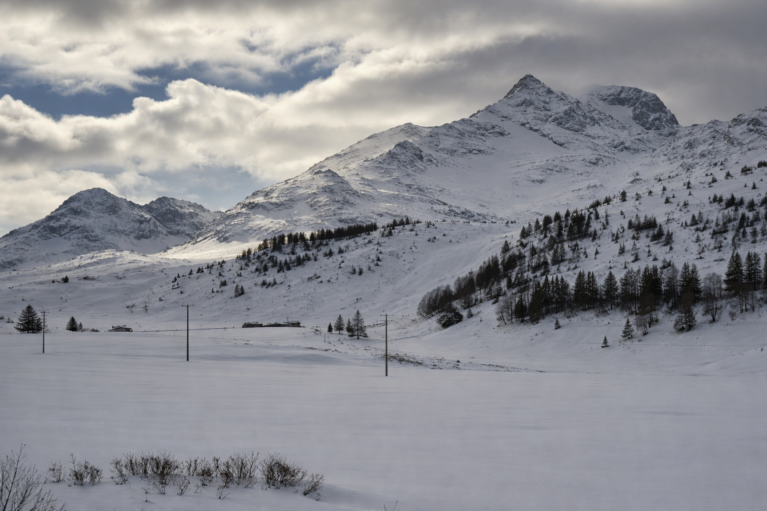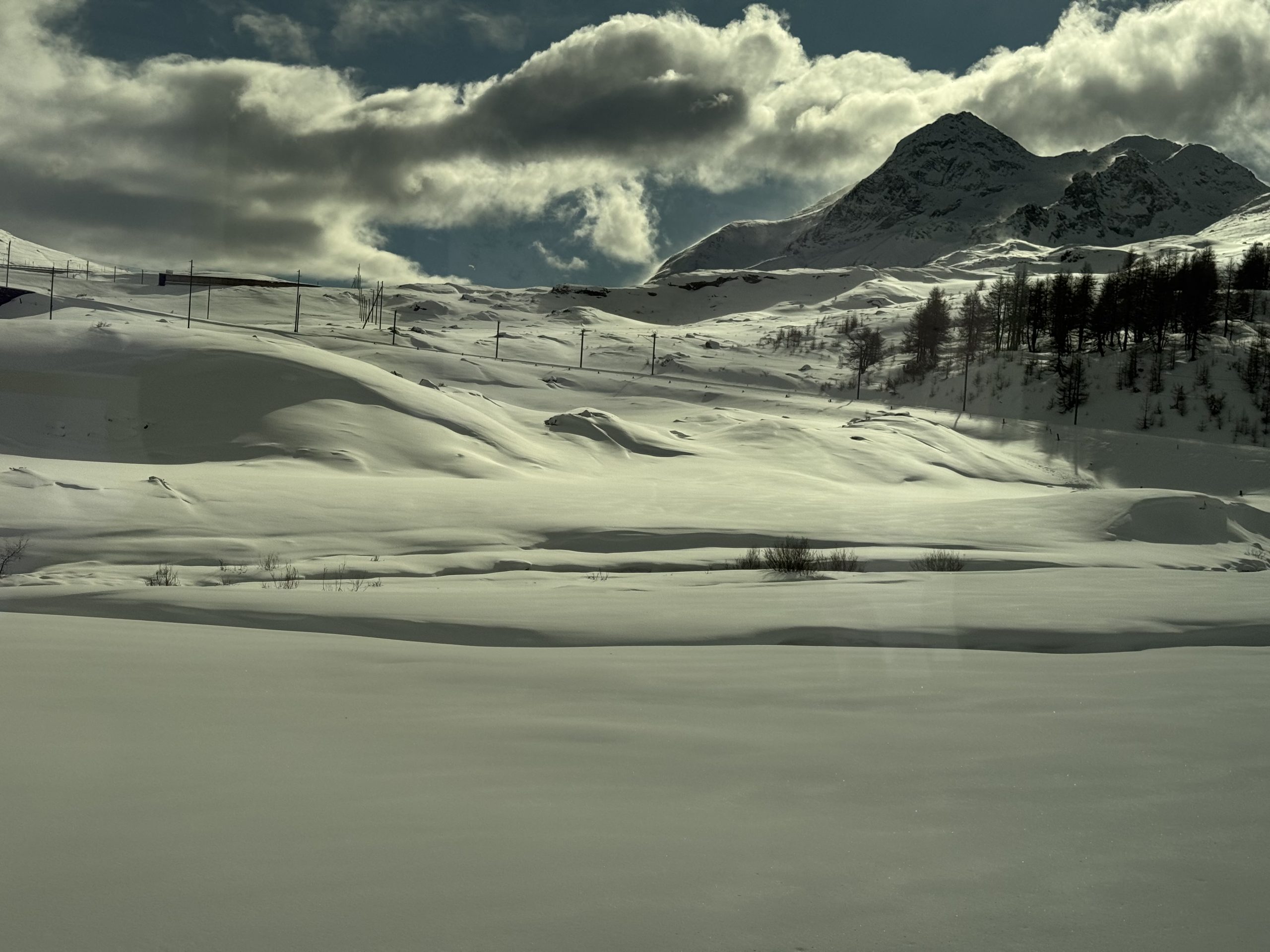 The trip from Landquart to St Moritz was an absolute joy. If this had been the main focus of the day, we’d have been delighted. The clouds lifted and we were left with a beautiful sunny day on fresh powder snow. Incredible mountain views, deep valleys, white trees. We had the carriage to ourselves, worked out that the window opened, and spent a wonderful couple of hours soaking up truly beautiful mountain scenery. At this point, I decided that the Bernina couldn’t really be any better than this.