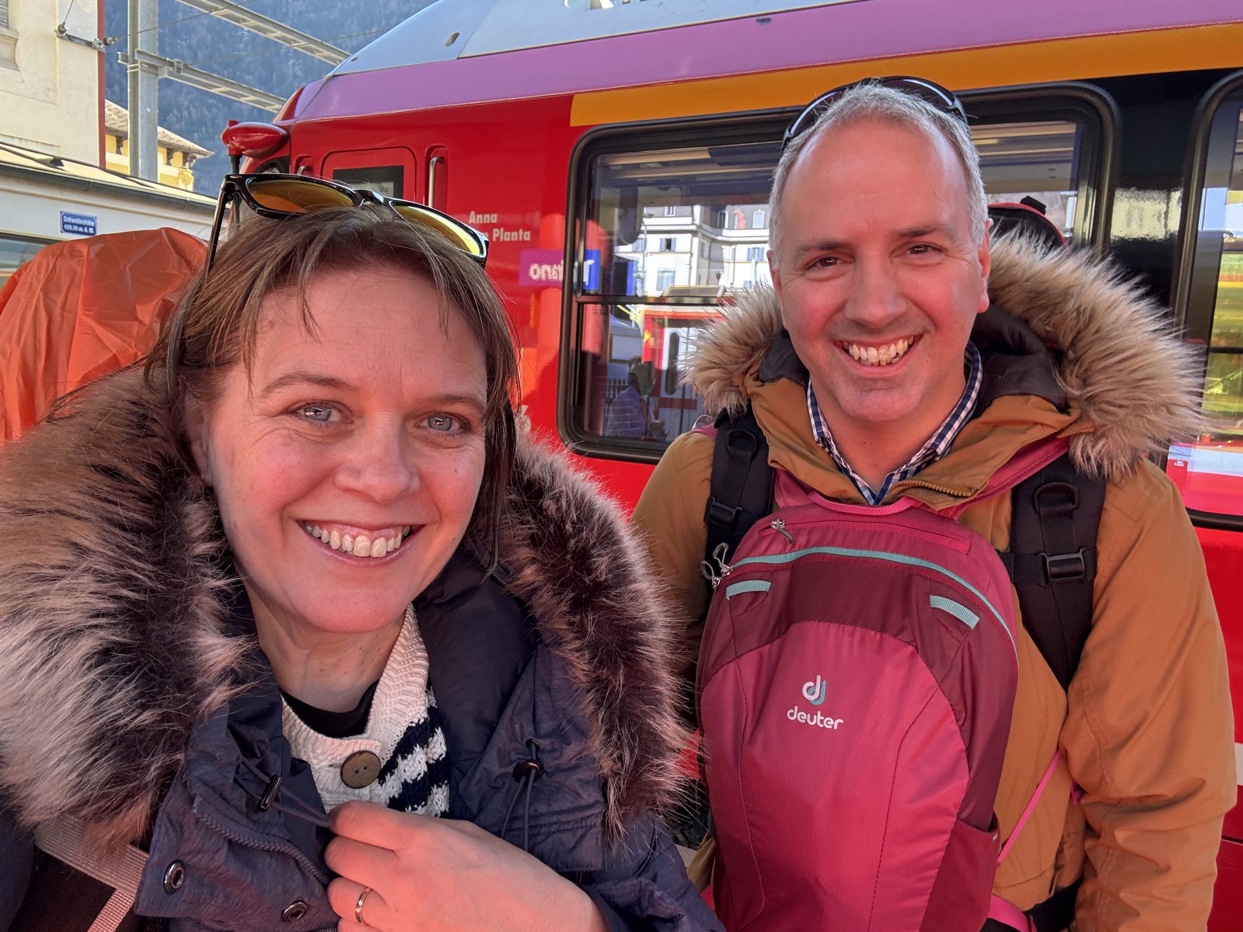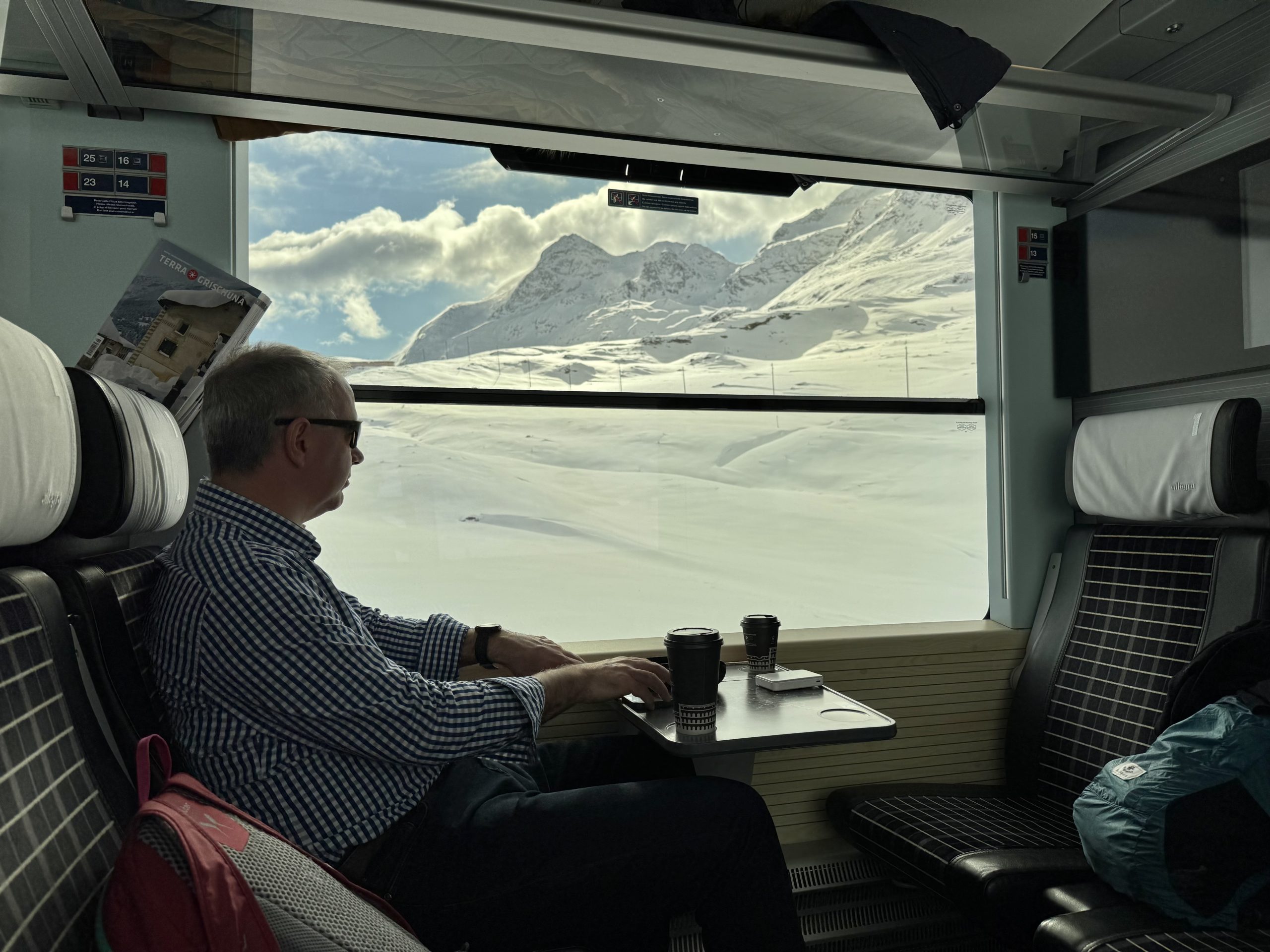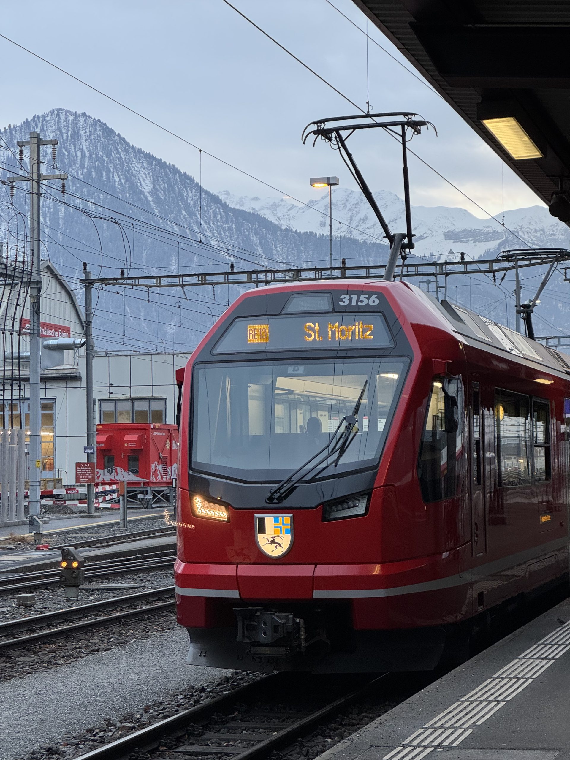 We set off just after 6am (in the rain! First rain of the trip – a shock), found a handy supermarket and good coffee at St Gallen station, and discovered our first train ready and waiting early, giving us time to settle in. The first hour passed gently and we were changing trains in Landquart to head to St Moritz just as the day was getting fully light.