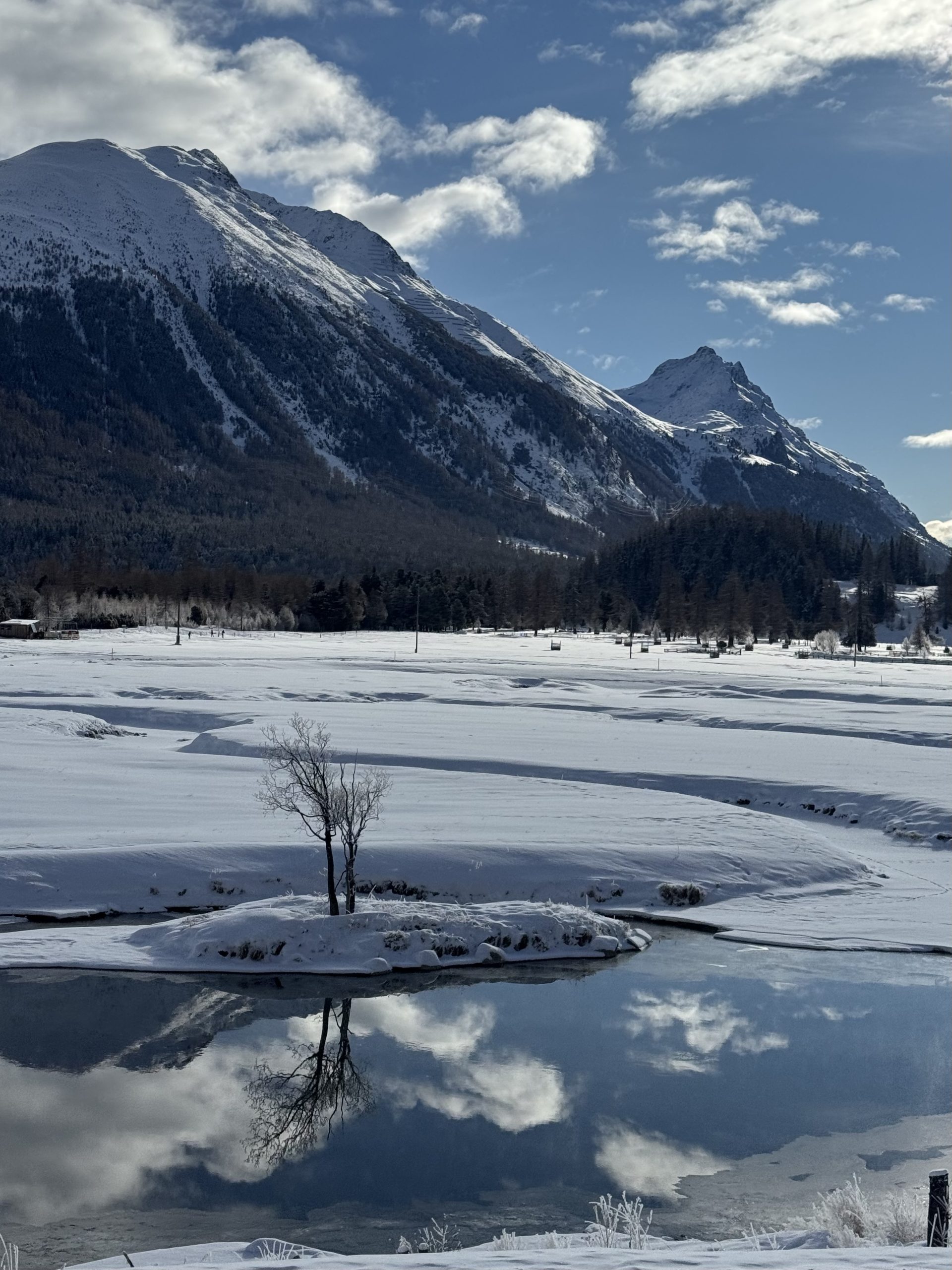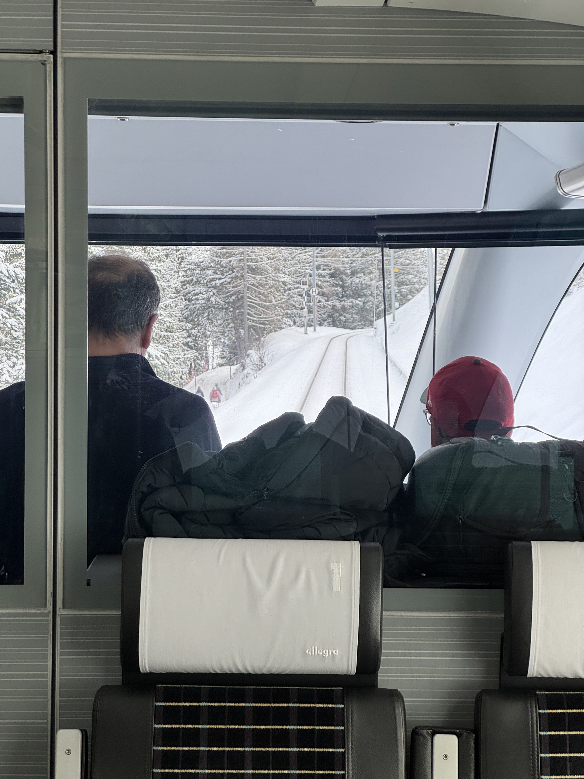 Getting off the train in St Moritz, the change in temperature was instant. A proper bite, that different taste that you breathe in once you get a few degrees or more below zero. The grand city up above the train line, frozen lake below. We grabbed refreshments from the cafe and got ready for our train to arrive. We’d been warned that the regional train route had got busy over the last year as people have begun to realise that it’s a great alternative option to the main trains. We couldn’t get the website to work to reserve a seat, so – with fingers firmly crossed – we jumped on the second it arrived.