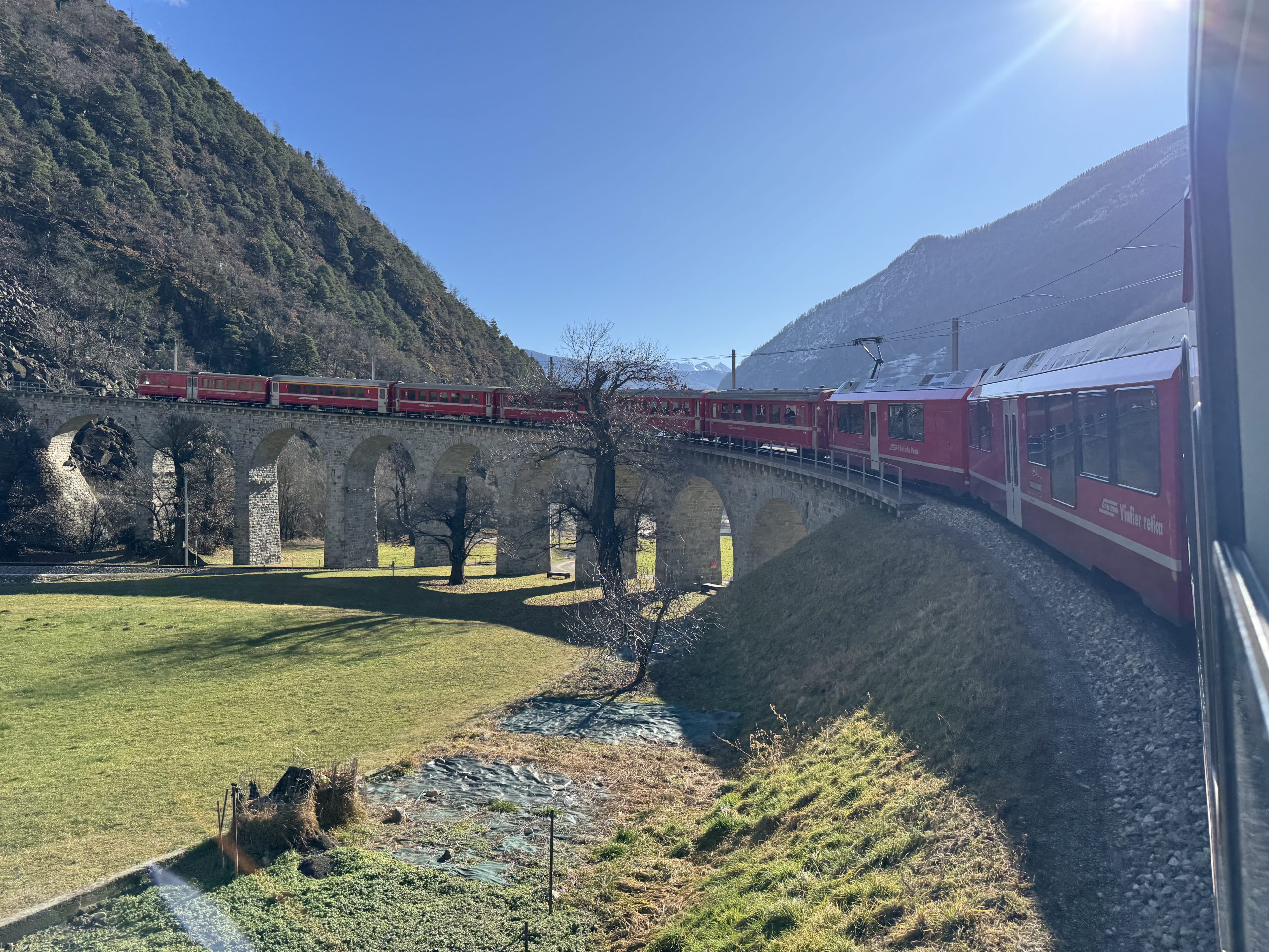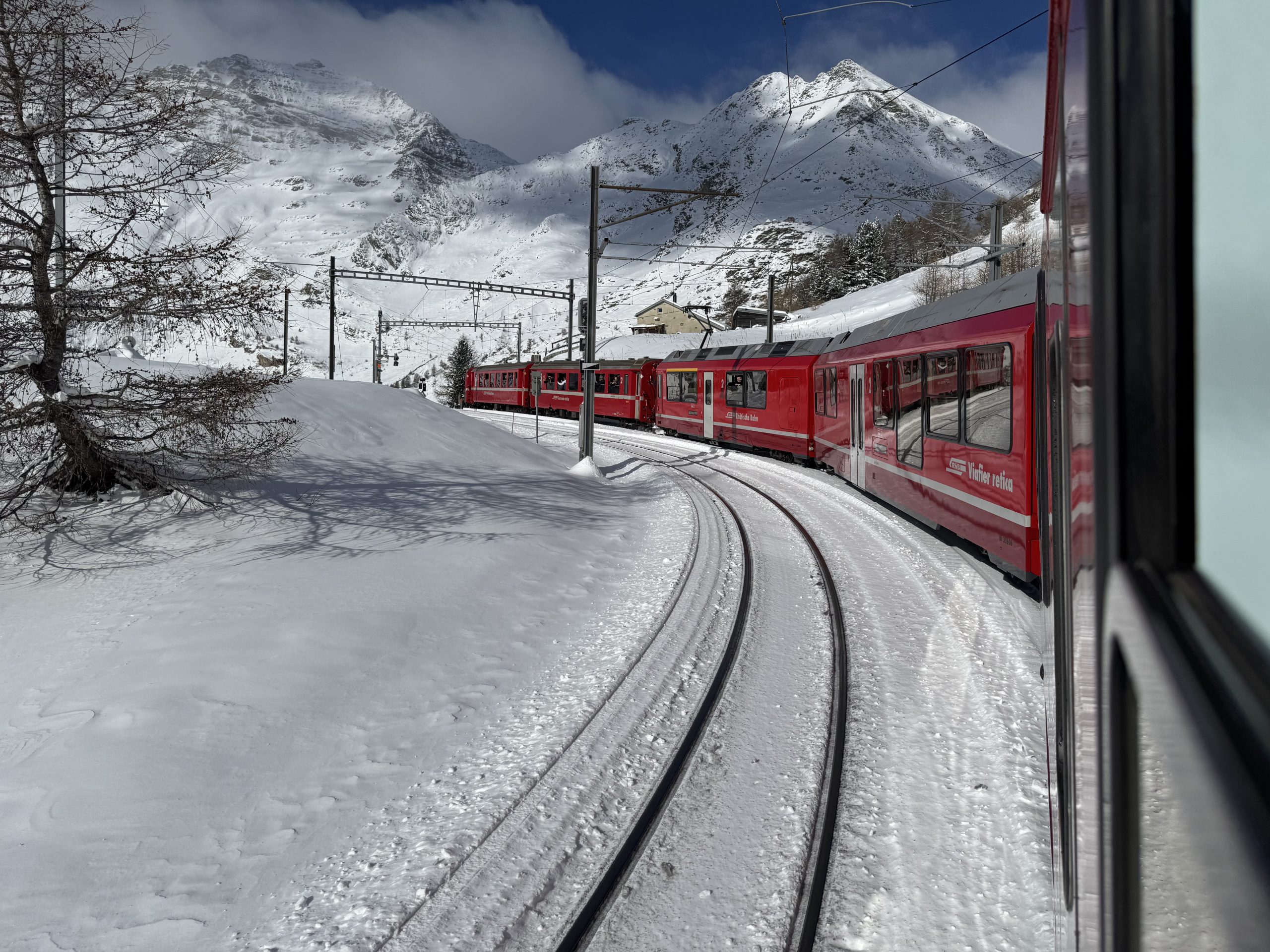 Eventually, heading down from the snowy heights into sunny Italy, we circled around the insane, unreal spiral of the Brusis viaduct, and, by the time we’d completed the loops, the snow was gone. We’ll see it again on distant peaks, but I don’t expect to see it again on the ground. I’ll admit to shedding a quiet tear. But, but, but. What a way to say goodbye and what a truly remarkable route the Bernina Express takes. However incredible you think a train ride could be, double it and then double it again. And then go and do it. As we head now into the sunshine and probably rain of a milder Italian winter, I’m holding those memories close and will always cherish this final day in winter heaven.