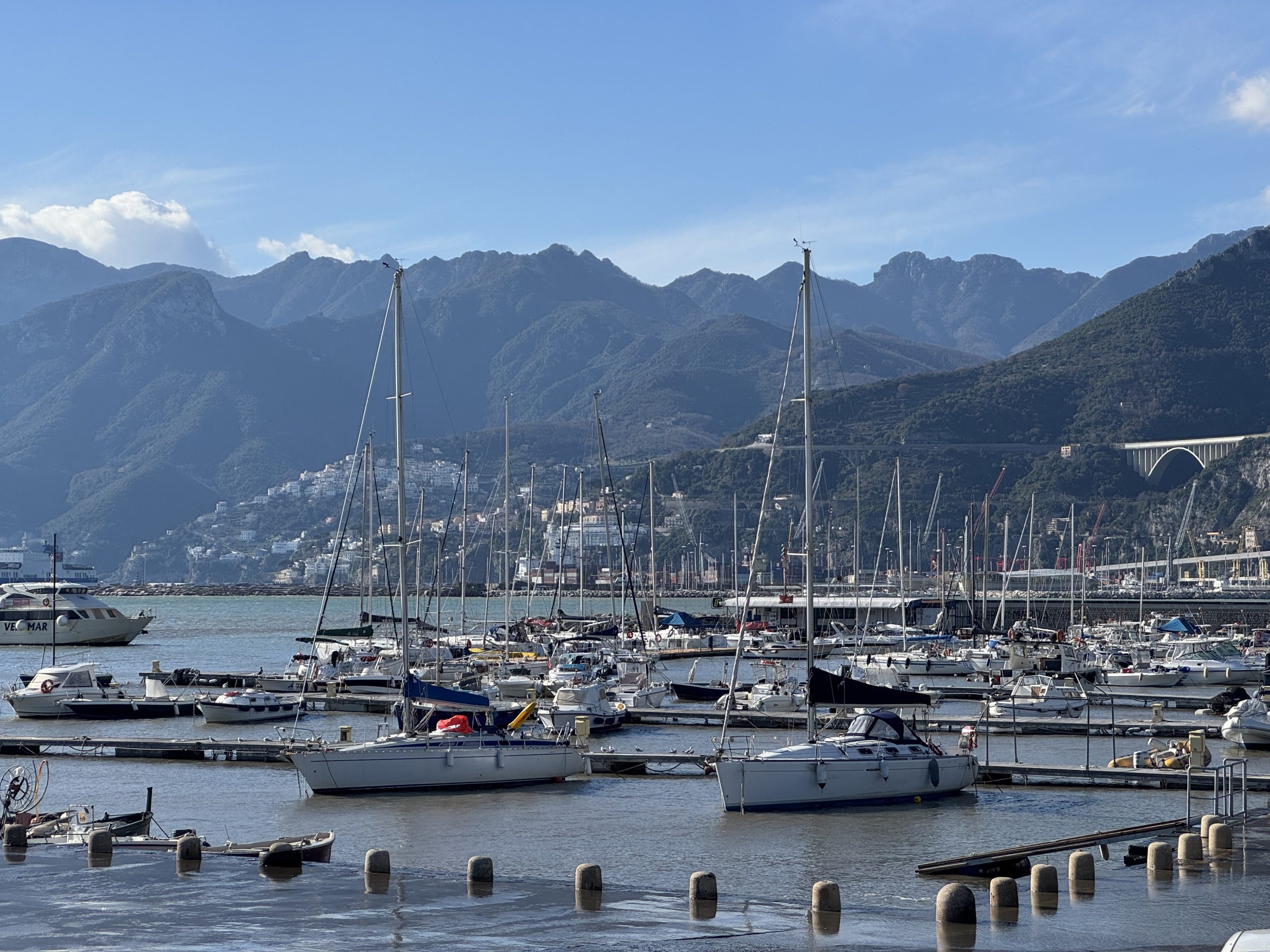 Our next transfer was in Salerno, our on-time train giving us the chance for a quick walk to the sea front. It was a sunny, blustery day and there were people sitting out in a pavement cafe – bundled up in coats, but still sitting out. A marina opposite and then, beyond, stunning views to the dramatic Amalfi coastline. It was windy and the waves were absolutely crashing in, smashing against the rock breakers alongside the harbour. By now it was mid-afternoon and we’d been travelling since 7am, so this little burst of air and freshness was so welcome.