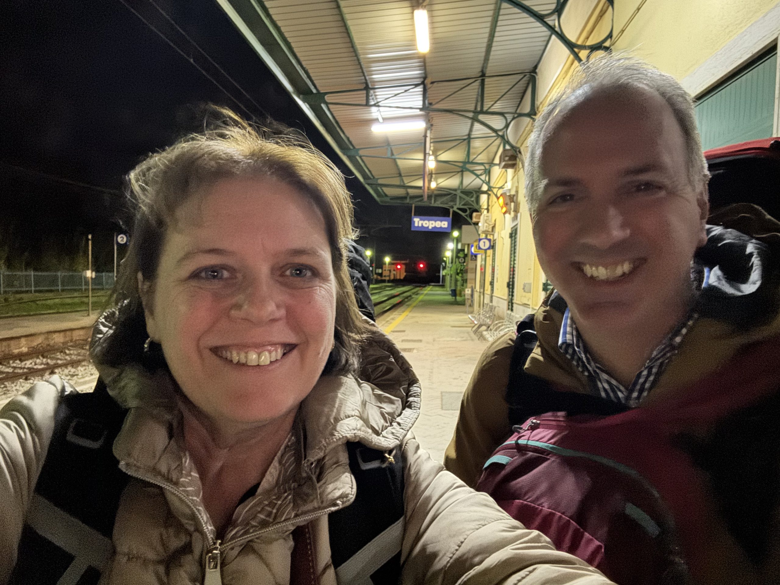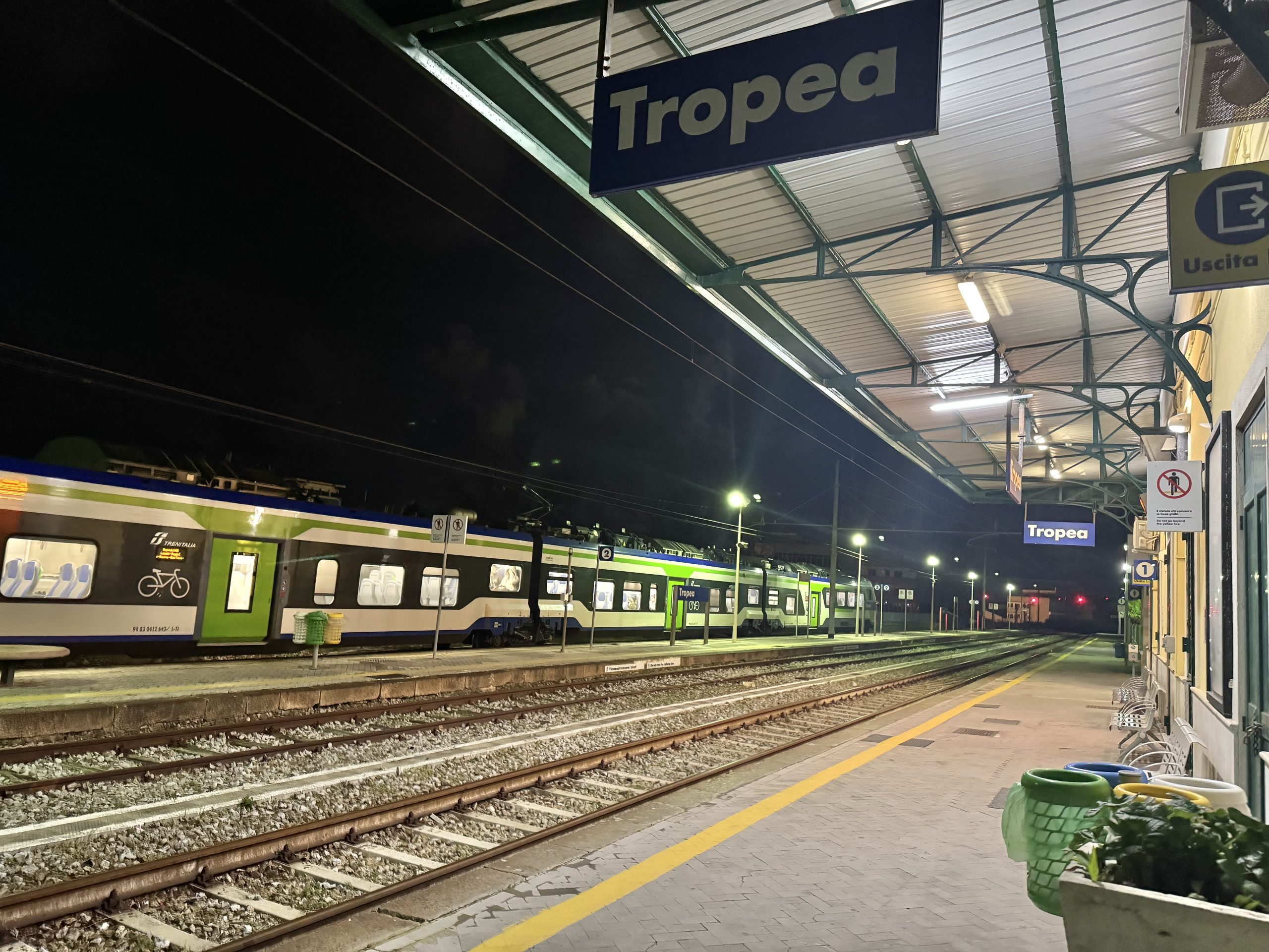 There were about five of us on the entire train, which set off in now-darkness on our final leg to Tropea. No views, stations so tiny that we often couldn’t see the platform or any buildings from our carriage.