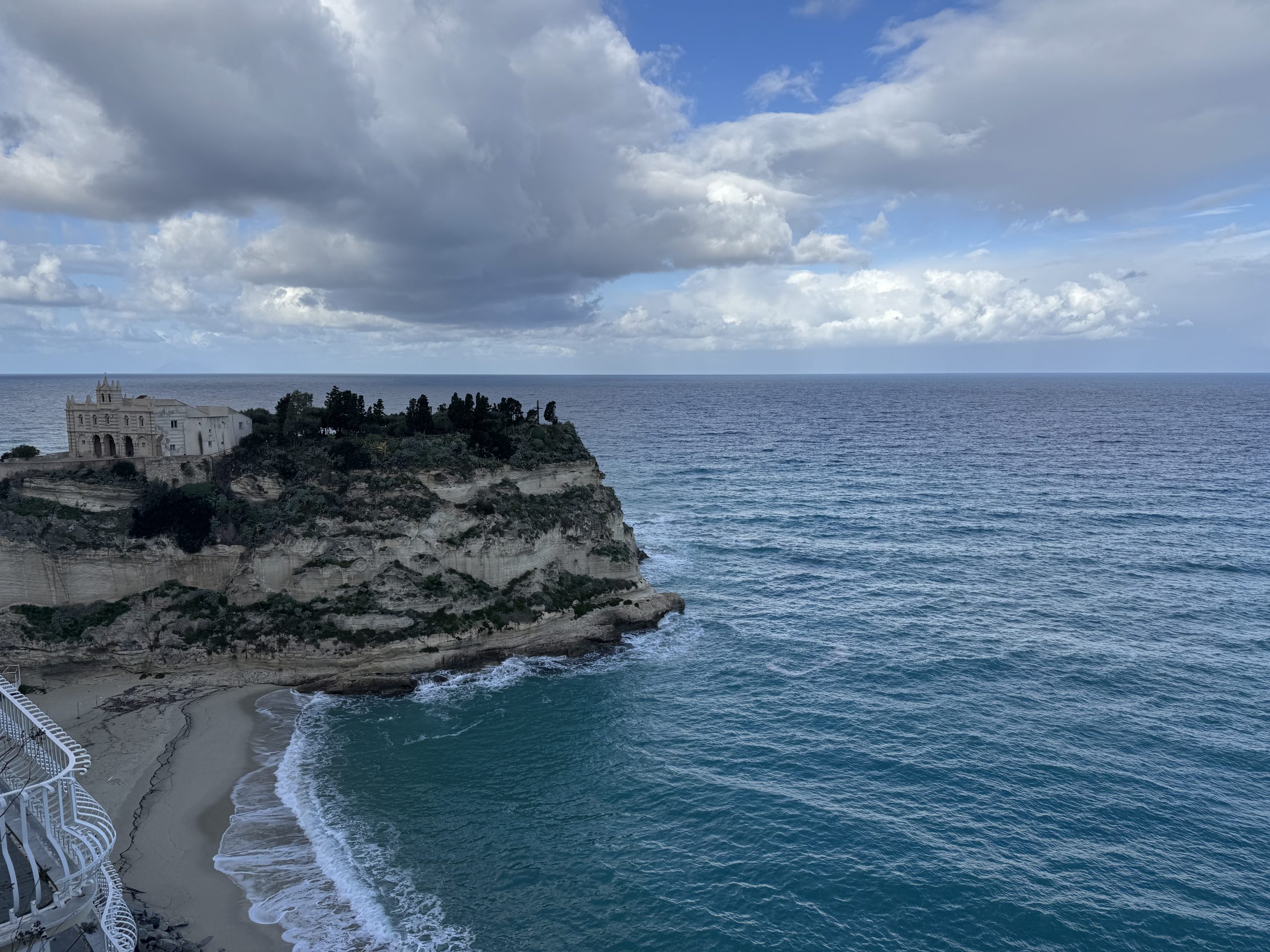 Tropea station was pretty much in darkness too when we arrived. We followed an equally dark road under the tracks and into town, down the hill – and emerged into a square of thoroughly unexpected pumping music and bars. Walking through the old town past some beautiful churches, into cobbled streets, past a couple of restaurants with people sitting outside under heaters. The sound of waves crashing somewhere ahead. Tropea looked lovely.