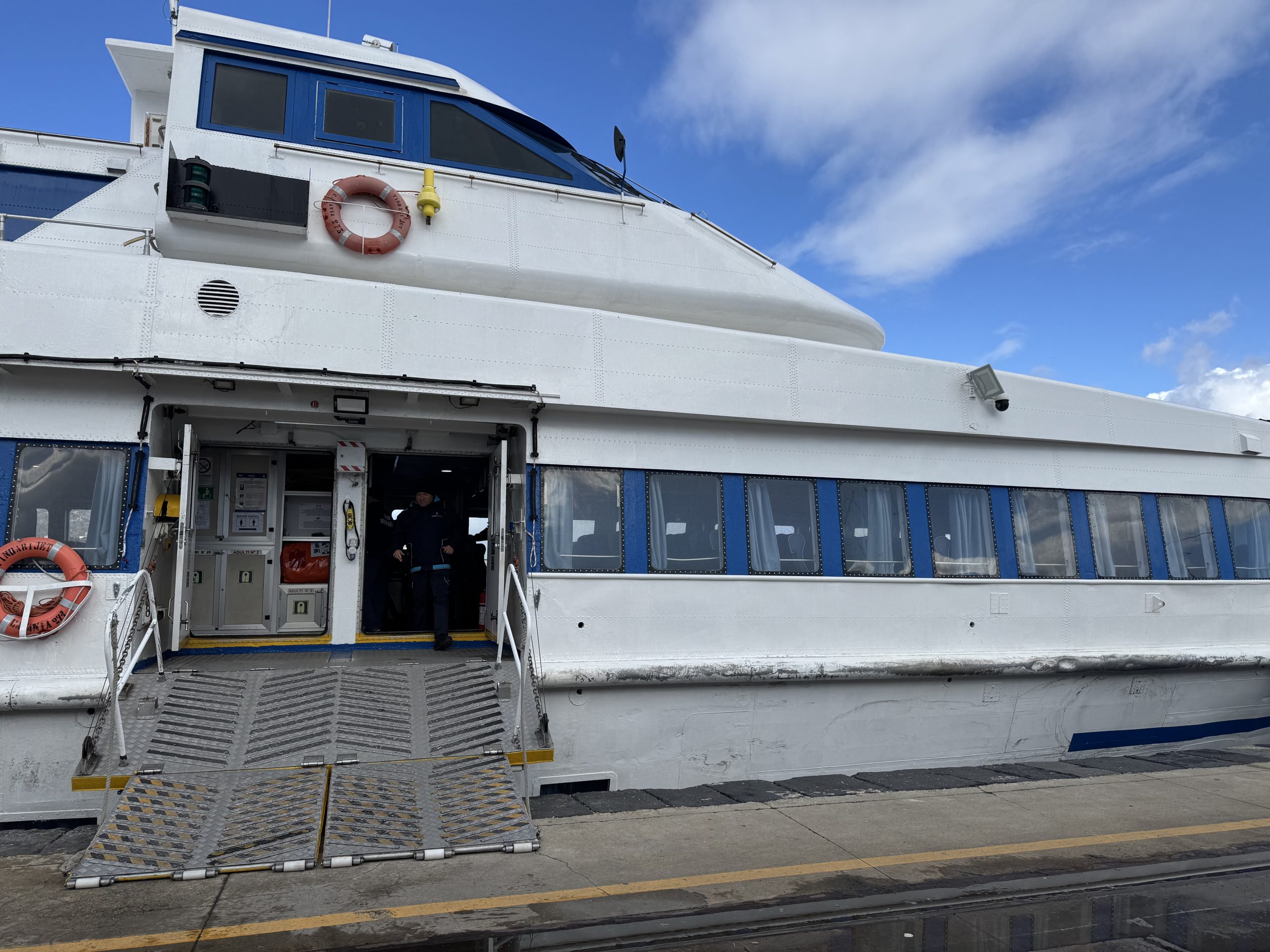 We arrived into Villa San Giovanni expecting a 10 minute walk and then an hour’s wait for the ferry to Sicily. What we found was a fast hydrofoil leaving in just a couple of minutes. Cue another dashed run, this time to the ticket office to grab ferry tickets for the grand cost of €2.50 each.