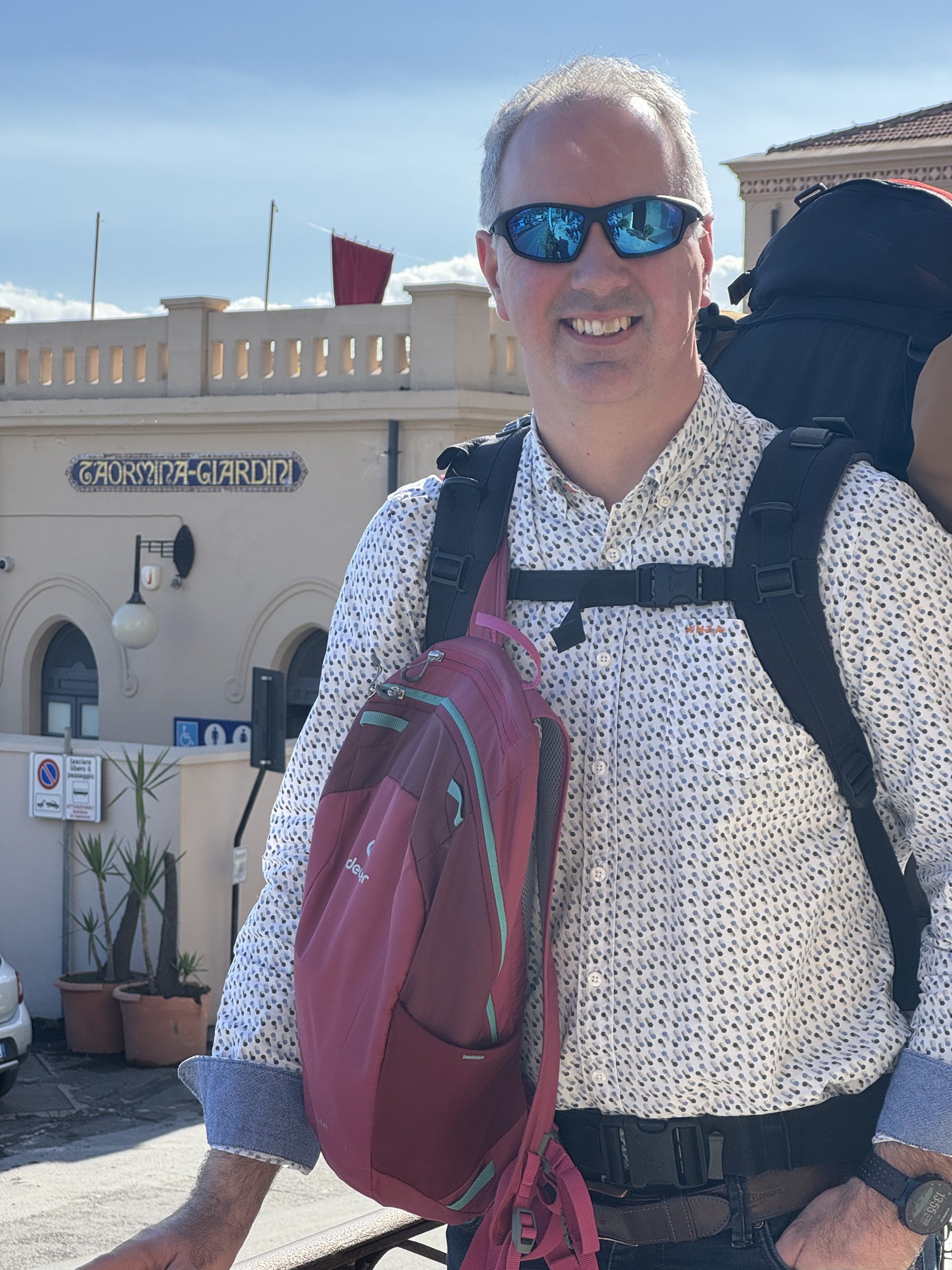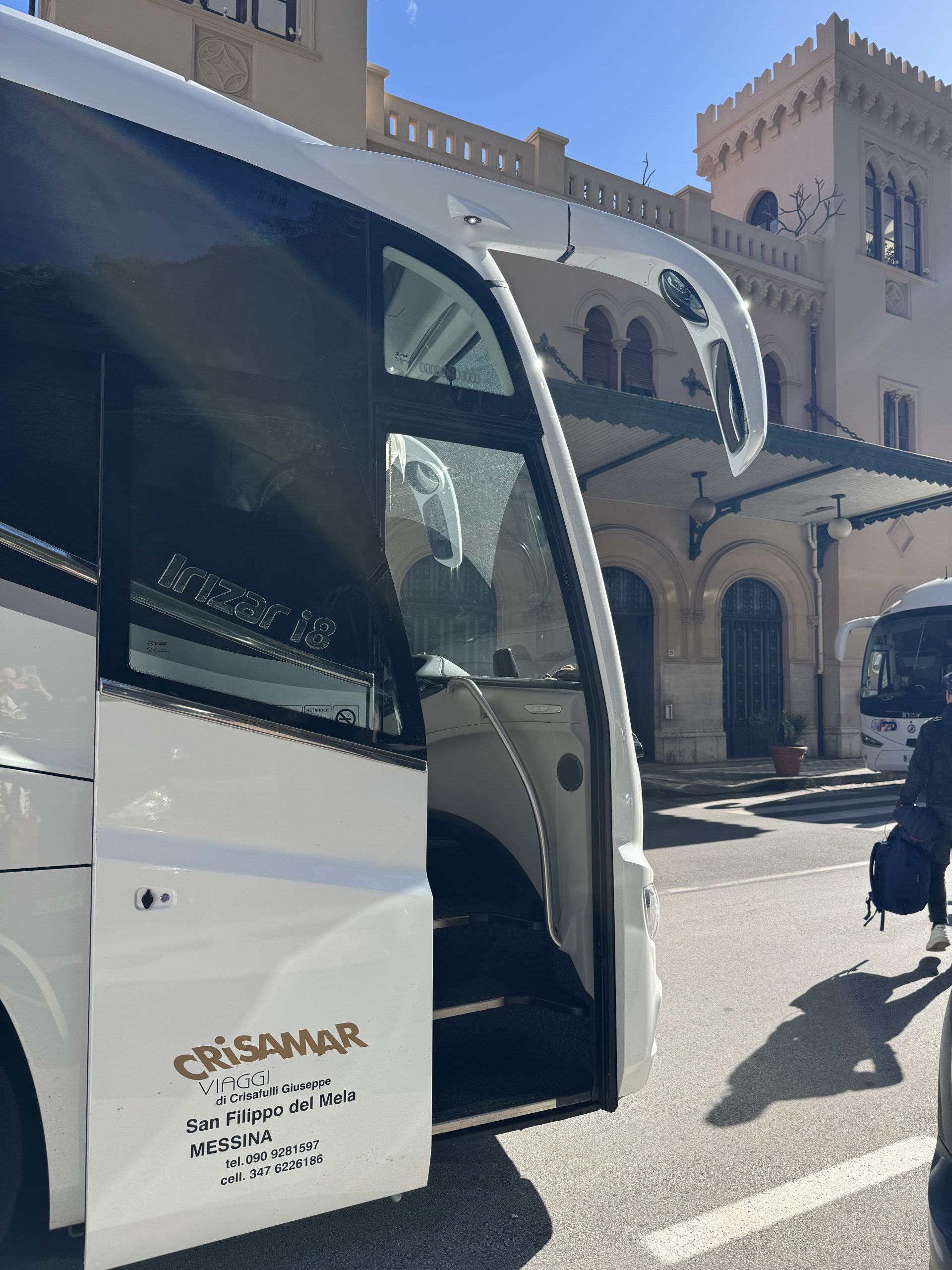 Among the storm damage was the rail line south of Messina. Trenitalia was therefore running replacement buses. With an hour to spare, we found a cafe and finally got Tim a much-needed cup of coffee to drink in peace. Obviously, five minutes later I discovered a different website with a completely new set of timings for the bus, in no way related to the train it was replacing. So, Tim downed his second coffee of the day and we took our third rucksack-assisted jog of the morning.