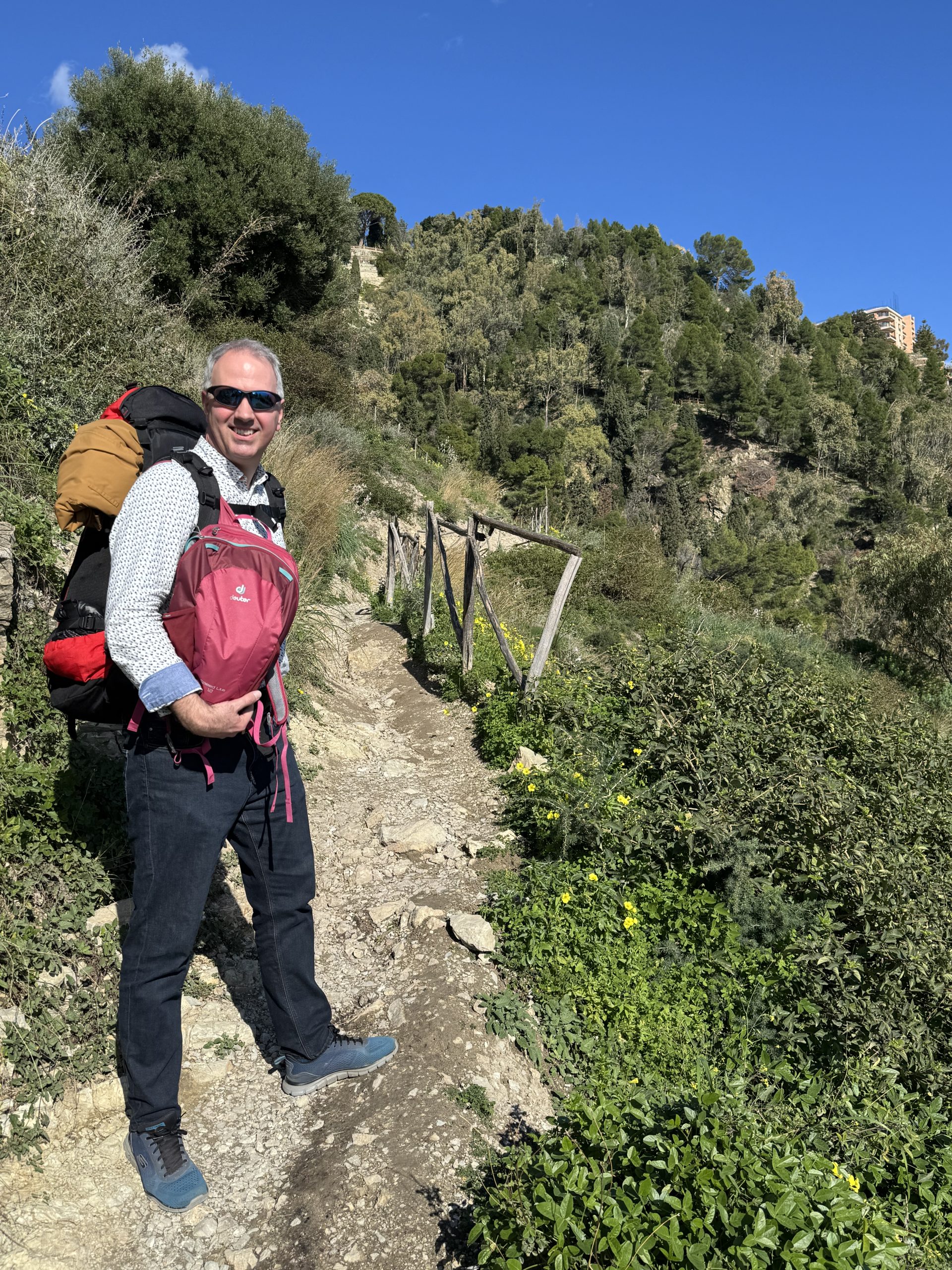 The walk from the station to the hotel was just under a mile. With just the one small impediment left – Taormina town sits 500 feet above sea level. The station: right by the sea. And so, for the final piece of this crazy journey, we followed a main road, which became a side road, which became a broad track, which became a dusty single-track trail. Winding its way steeply up the hillside, rocky under foot, yellow flowers alongside, the occasional rustic wooden fence where the path turned through 180° degrees to snake up the cliff. A lizard ran across the path ahead of us. Each hairpin bend gave us more thrilling views back down to the turquoise sea below.