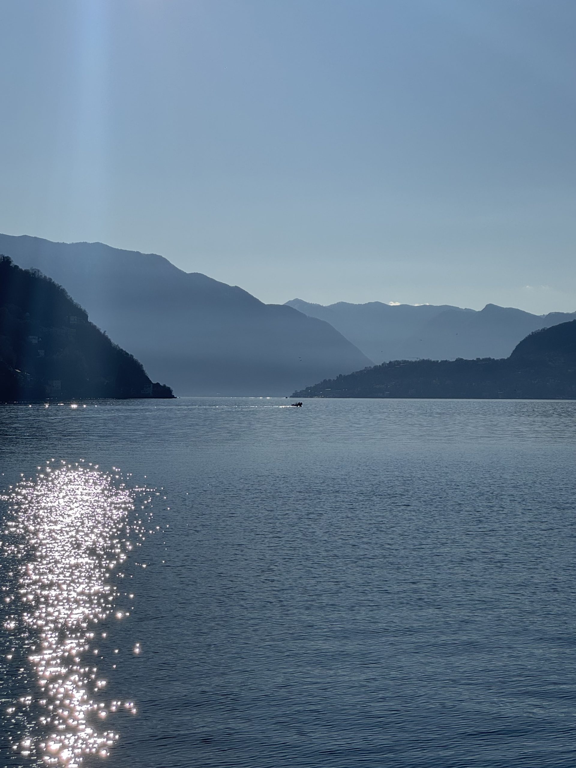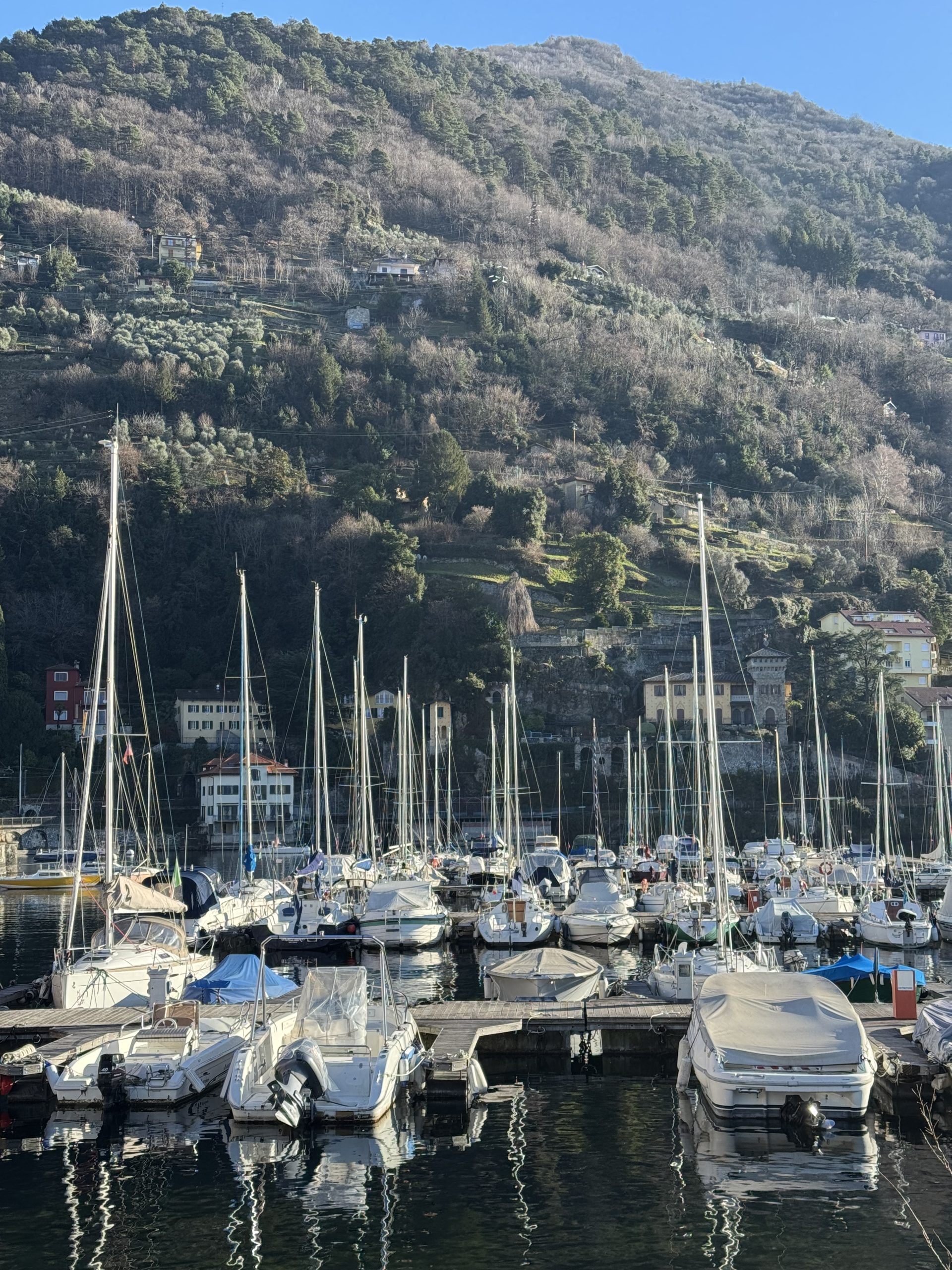 In summer, boats of all kinds fill the waters of Lake Como. In winter, not so many, but it was lovely to see some still running and to be able to take advantage. We sat right at the front of the deck, wind in my hair, sun on my face, cold but gorgeous. Fantastic views from the 20-minute crossing: small villages spilling down to the lake, churches impossibly high up the mountainsides, steep wooded hills and rocky summits beyond.