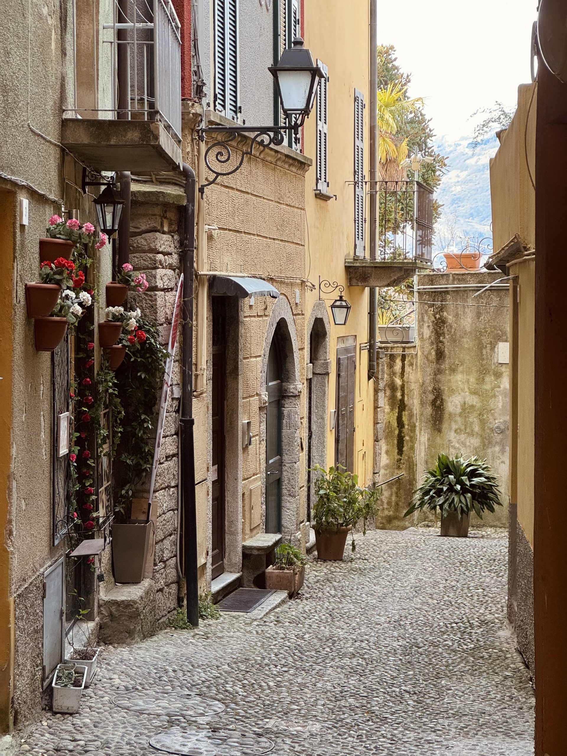 Bellagio is probably the most famous town on Lake Como. It sits right at the point where the lake splits into two branches. Tiny cobbled alleys rise steeply up from the flower-lined promenade, narrow stairways lined with restaurants and tiny shops. All closed in January of course, but still so pretty. Warm pastel buildings with shuttered windows. Iron lamps, flower tubs, twisting staircases with tantalising glimpses of blue lake below. Up above, gardens. Off around the coast, grand villas and high walls keeping out prying eyes. We’re not quite far enough round the lake here to meet George Clooney, but there are some very grand and beautiful houses.