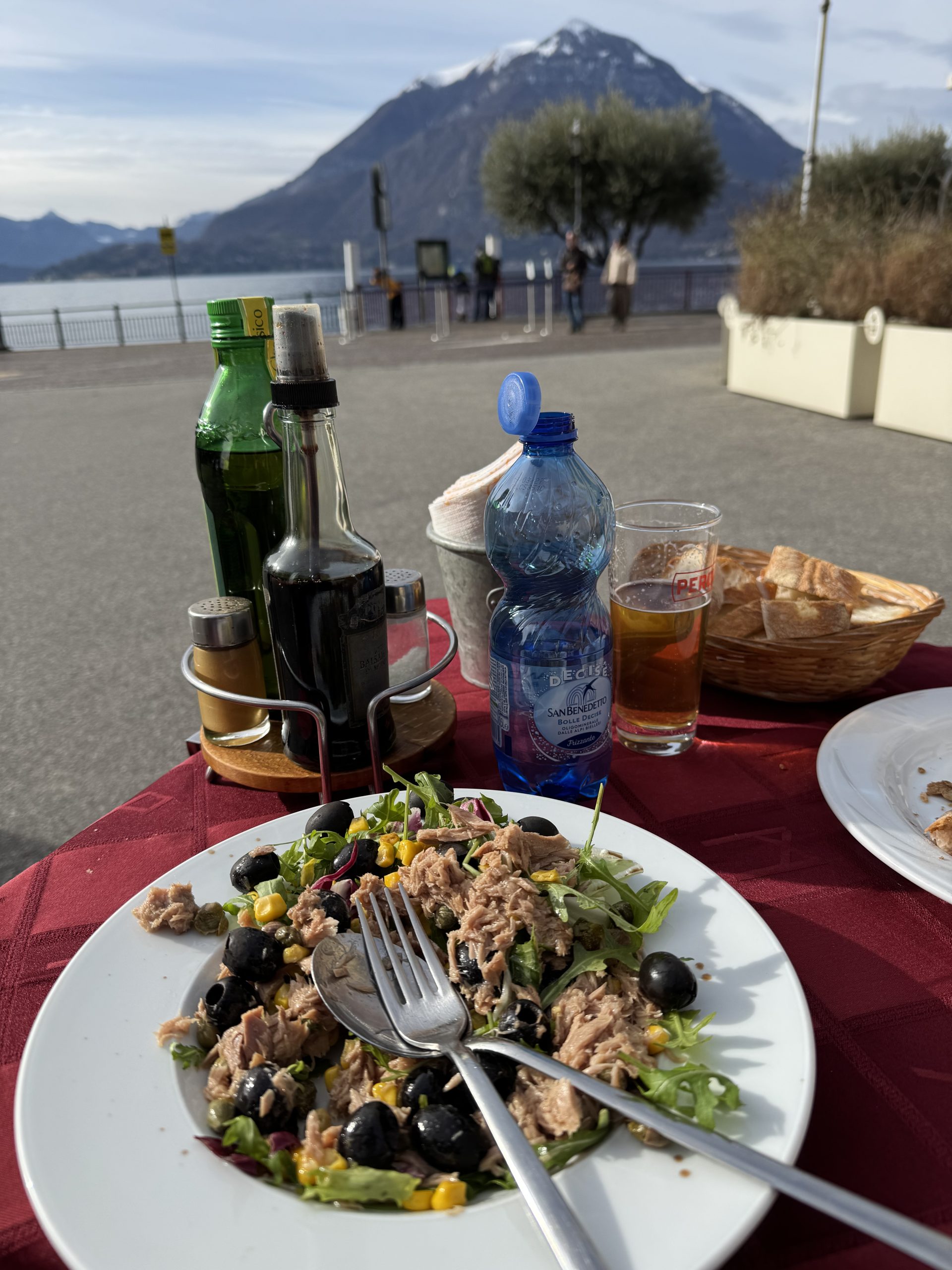 Back in Varenna, there was time (and sunshine) left for lunch outside by the jetty. Big coat on, but oh so lovely. As we left, the clouds were gathering and we waved goodbye to both Lake Como and also the sunshine for a the next few days.