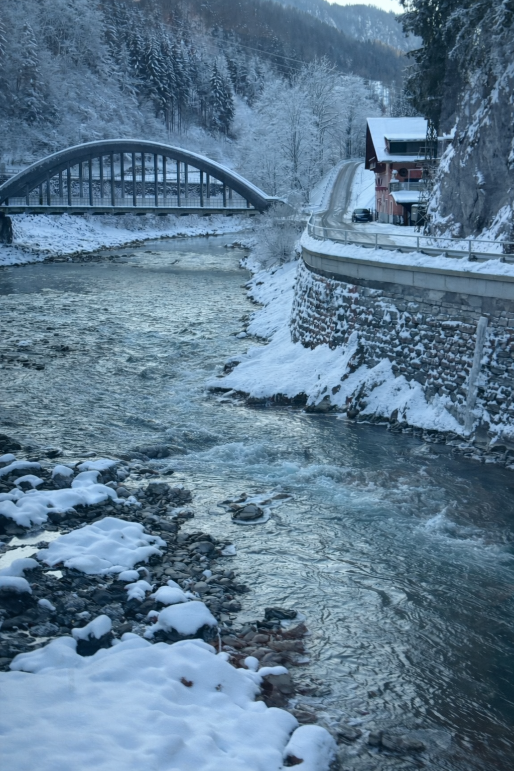 Onwards again, and now for an extra-scenic train ride. The train to Zell am See follows the Salzach river upstream for its whole journey, from the wide, elegant version that flows through Salzburg to its younger mountain self, high up in the Alps. The train line hugs its banks as it turns deep jade and still in the sunshine, and watches as it races over rapids and becomes icy and black in gullies too deep to see the sun. Hoar-frost-whitened trees and views up snowy pastures to high mountains. A beautiful way to spend a couple of hours on a train that is in no hurry at all, rolling gently through the landscape stopping every few minutes for another small town or village. Exactly the kind of travel we were hoping for.