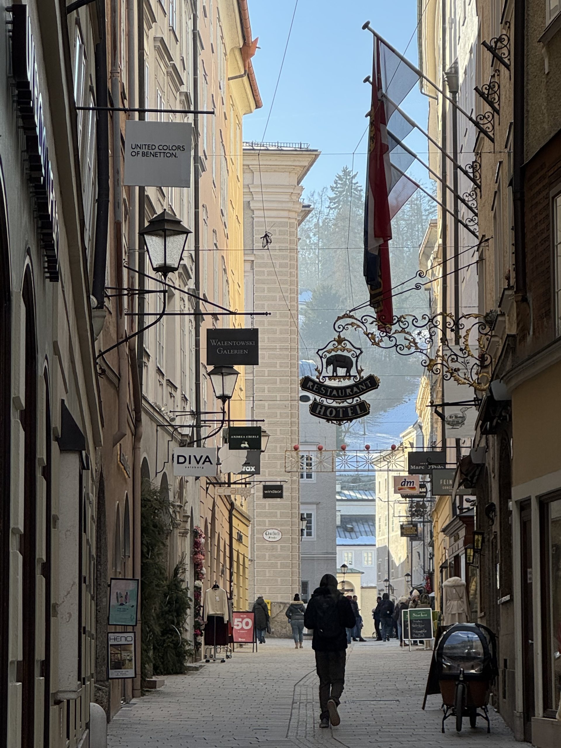 The first view of the old town from across the river was absolute winter morning perfection. Snow on roofs, a hazy sunlight, the castle rising soft and gentle in the morning light. We headed into the old town, waved to Mr Mozart’s Geburtshaus and wandered through a surprisingly quiet city. The small cobbled streets of the old town were lacking the usual throngs of people, the town gentle and sleepy on a Wednesday morning. I always love the ornate shop signs hanging above the streets, all gold and intricate metalwork. From its wide avenues to the tiny alleys, Salzburg is such an elegant and lovely city.