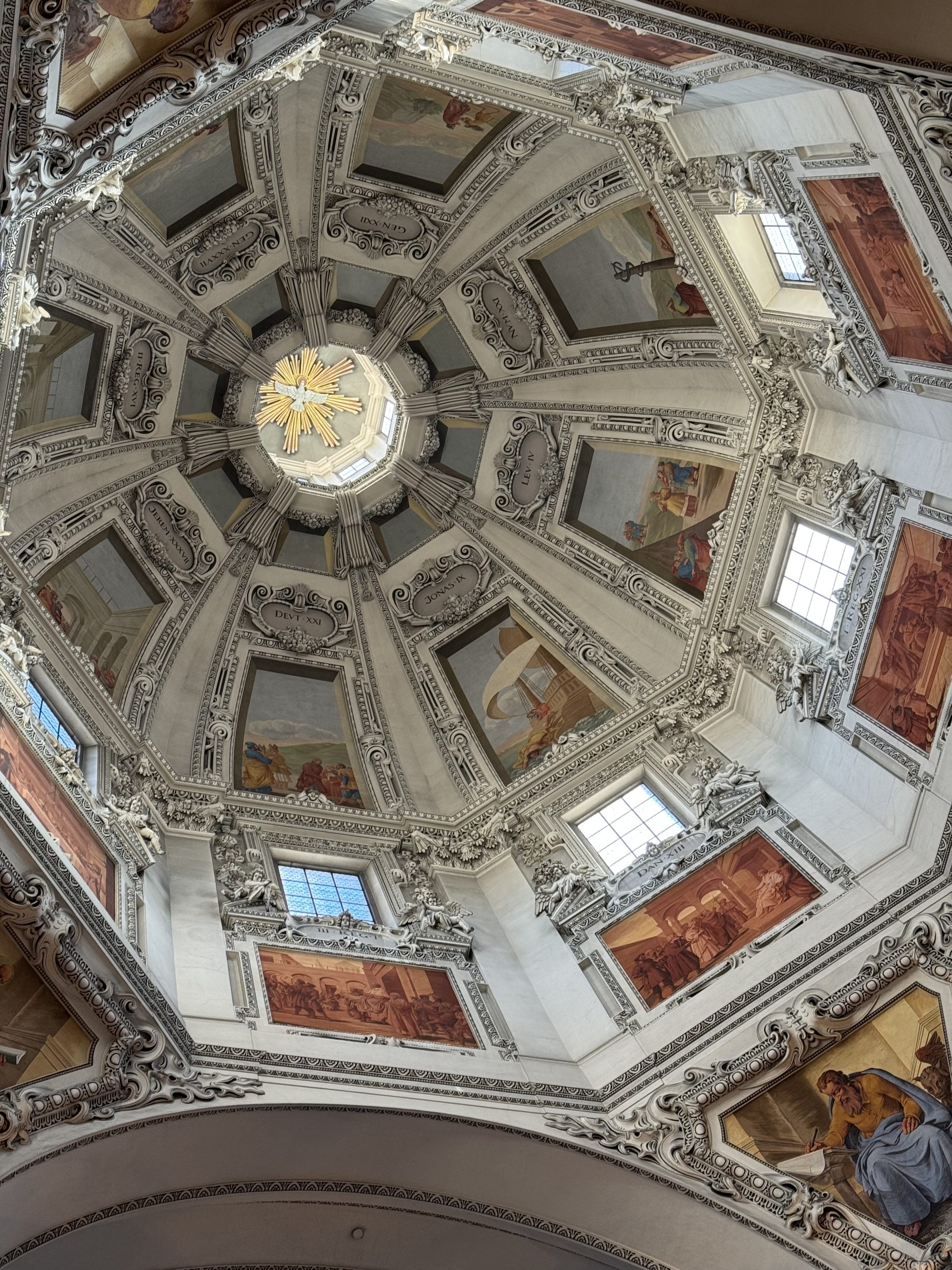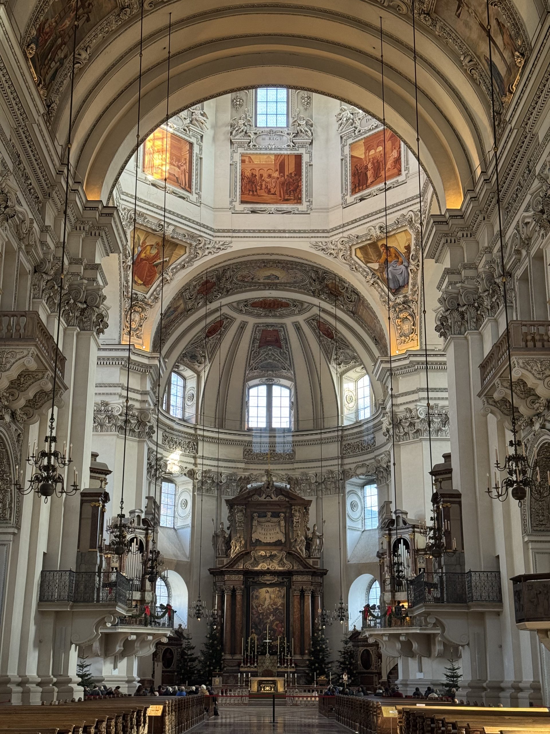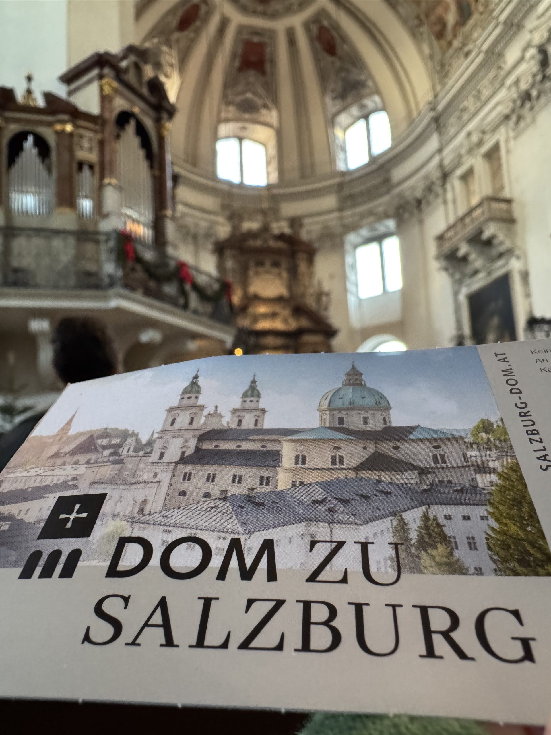To get all three things on my teleport list, we needed music. Even in Salzburg, I’d assumed this was unlikely in a three hour stop. However, we’d spotted a midday concert in the cathedral. Under the ornate and stunning dome, we drew breath while an organist played each of the cathedral’s organs in turn. Salzburg cathedral has seven organs (five main ones and two smaller mobile ones), to make the most of the acoustics in such a huge space. We got to hear three of them before we had to leave for our train. The boomy, bone-deep main organ. The delicate, music-box Venetian. And my favourite: the warm and elegant Holy Spirit. A lovely opportunity to listen to the differences – and to hear some gorgeous music in the peace of the beautiful cathedral.