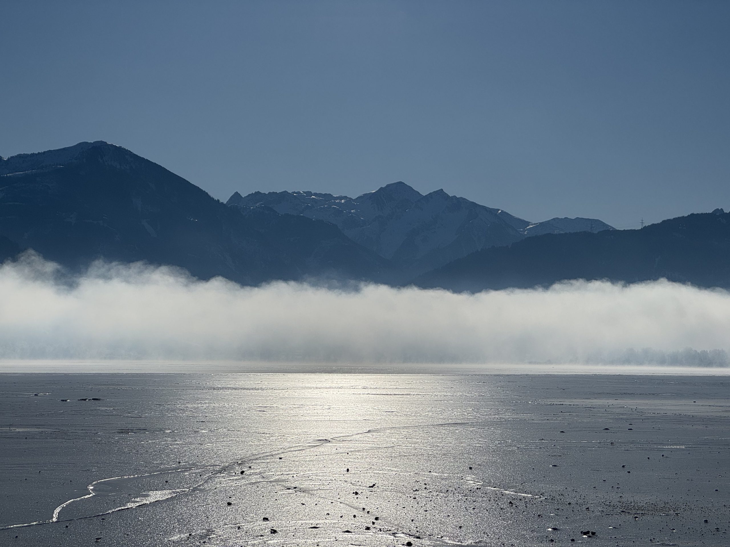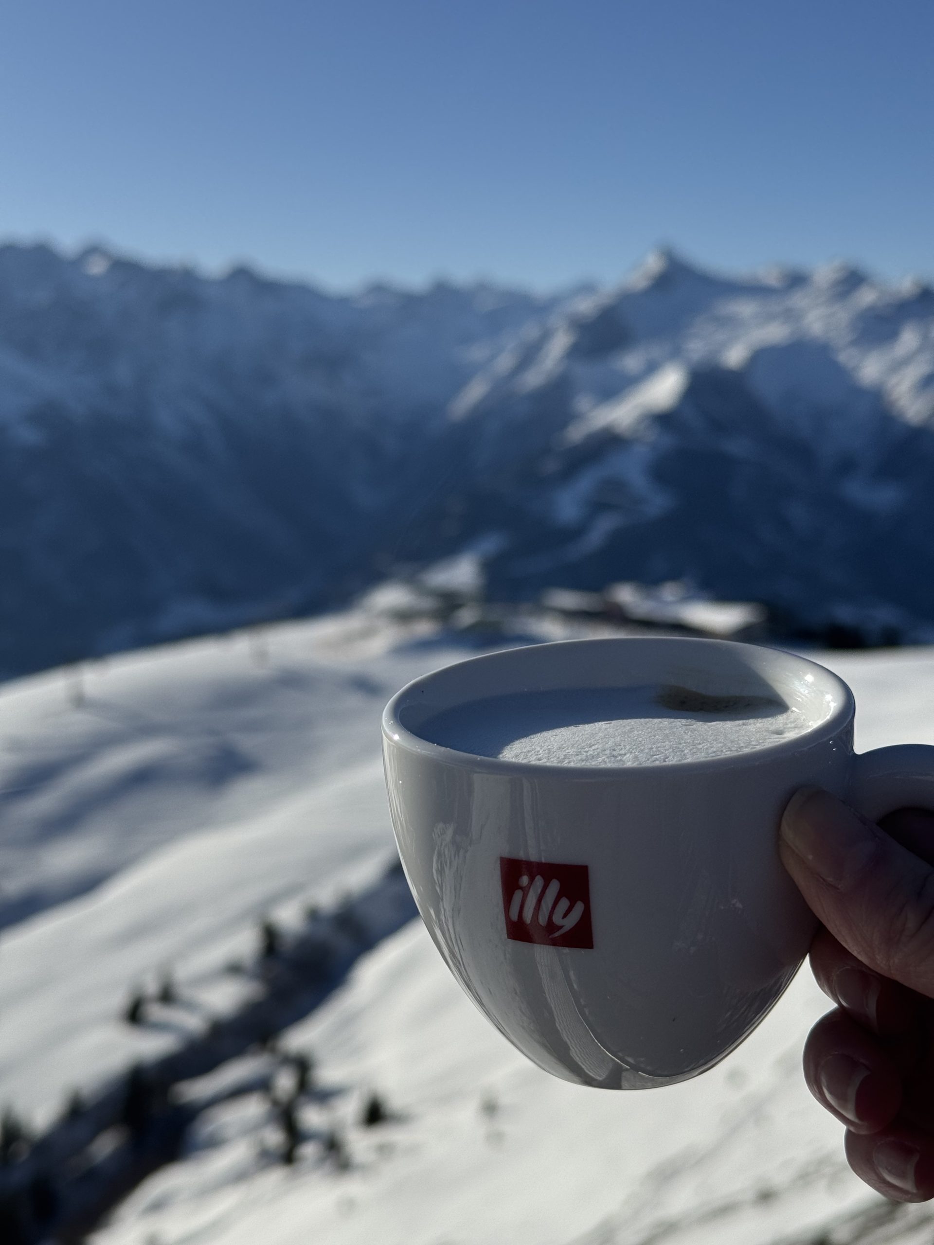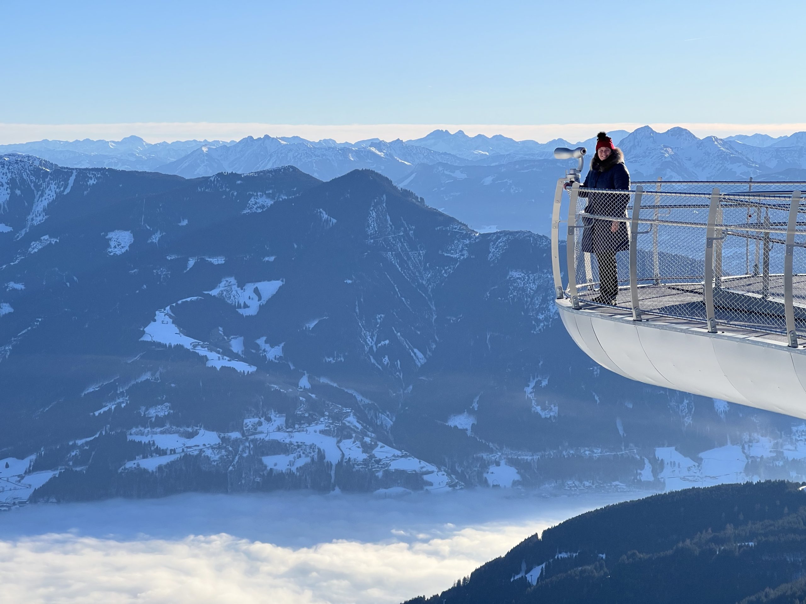 The advantage of being a non-skier: everyone else skis off down the slope and you get to enjoy the mountain to yourself. It was heavenly at the summit. Airplane-worthy views of white peak after white peak in all directions. The lake below under thick mist; the slopes above under blue sky and sunshine. Pistes stretching out below, waking up for the day. We spent a happy half hour at the viewpoint, soaking up the sense of space and endless mountain heaven.