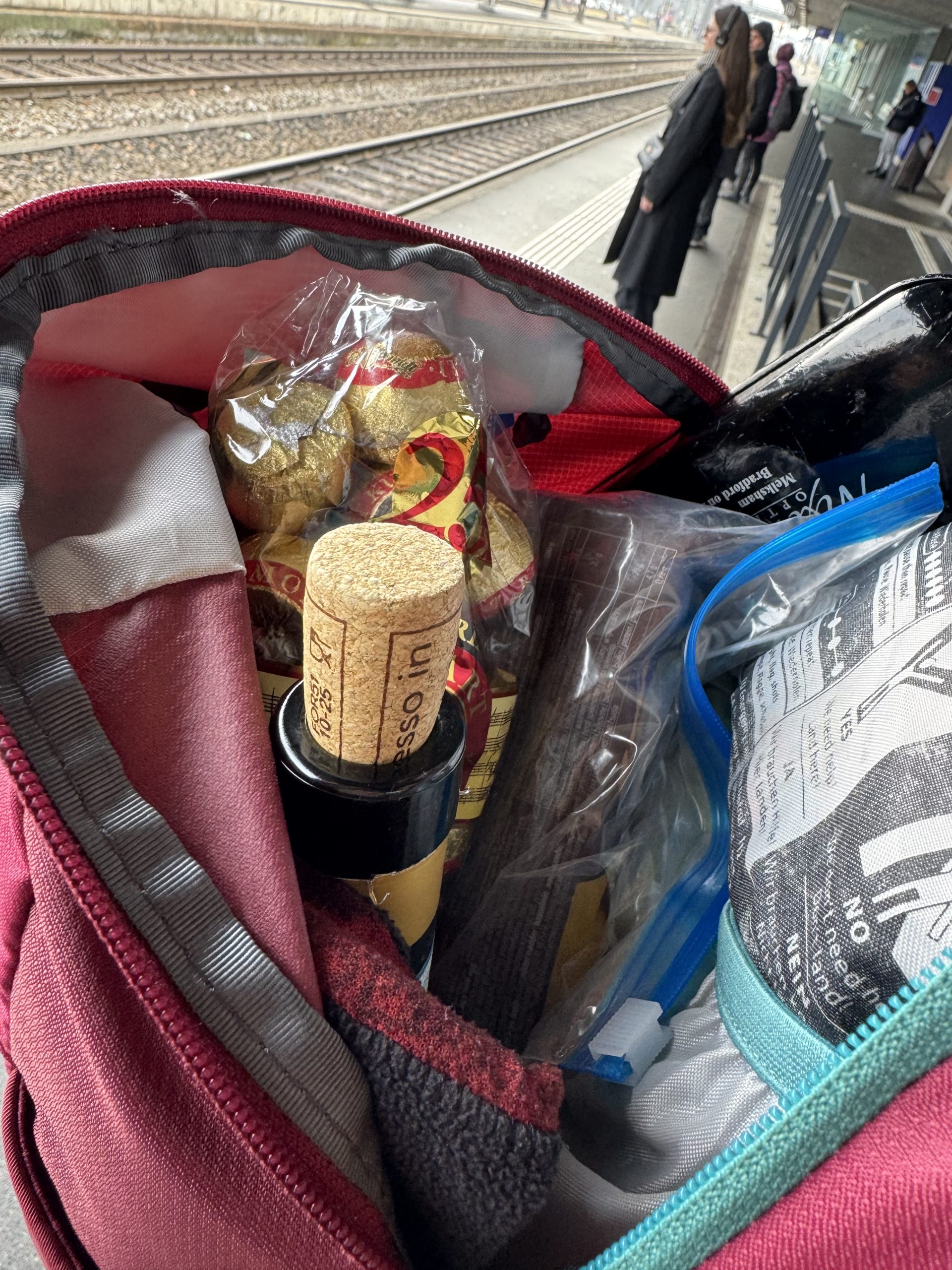 Standing on one of the station platforms along the way, Tim opened his daysack to reveal that he was carrying half a bottle of wine, stopper carefully back in the top, and half a kilo of Mozart balls. I knew there was a reason I love to travel with him.