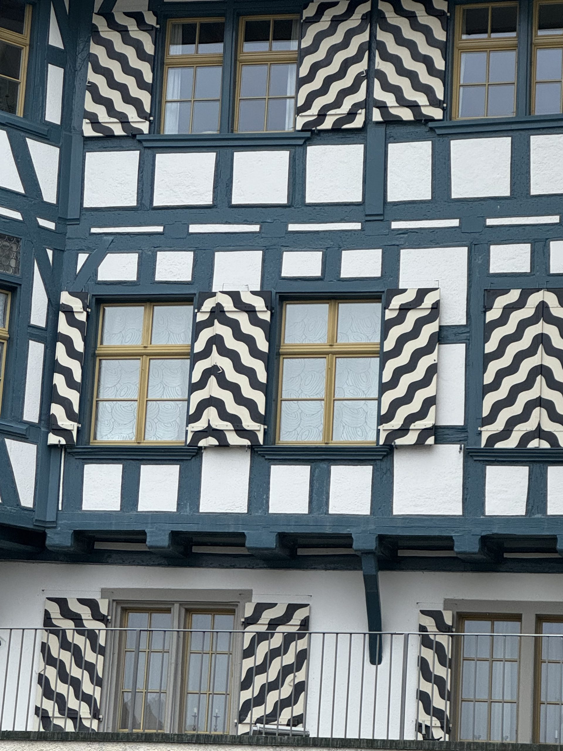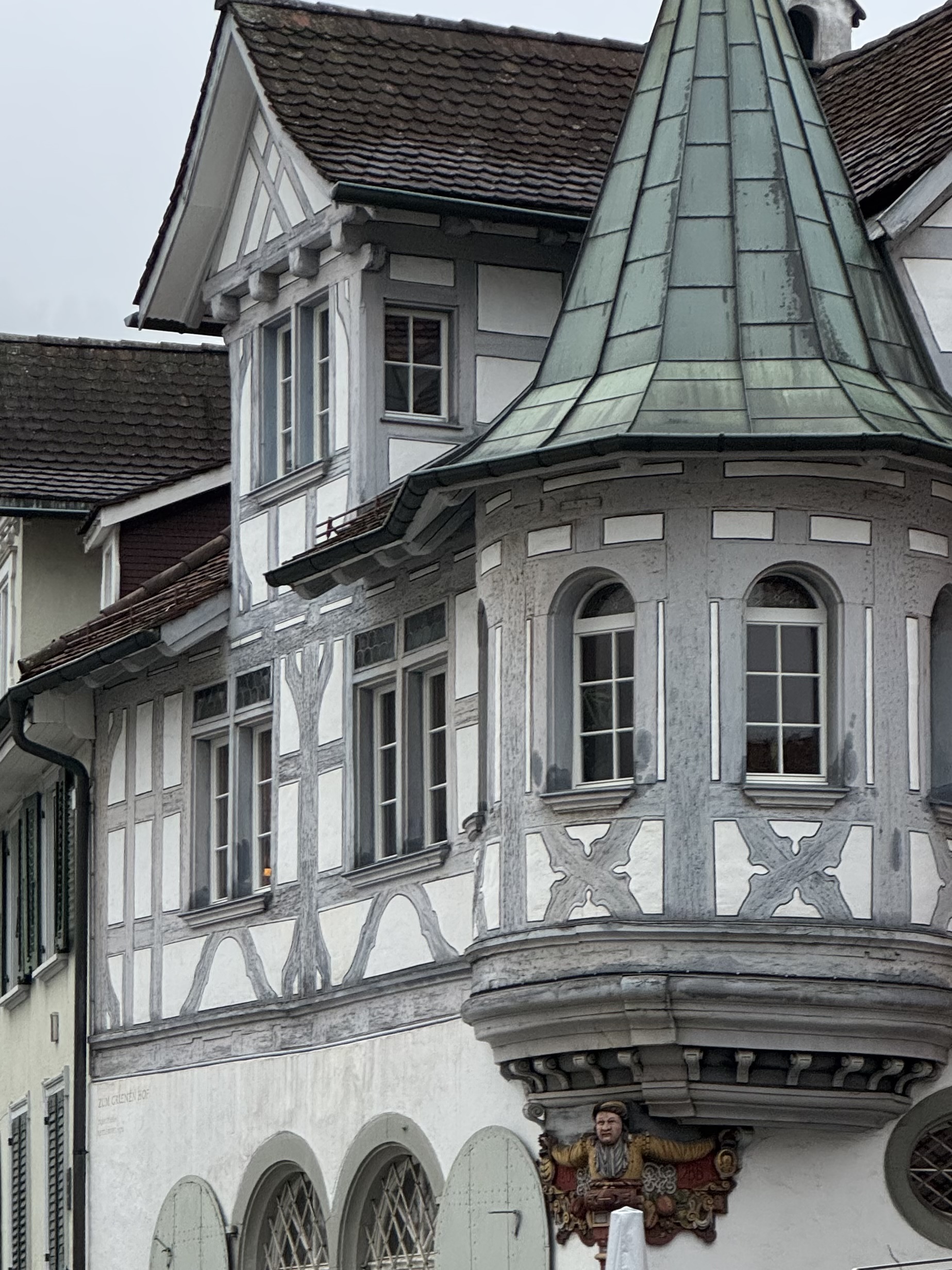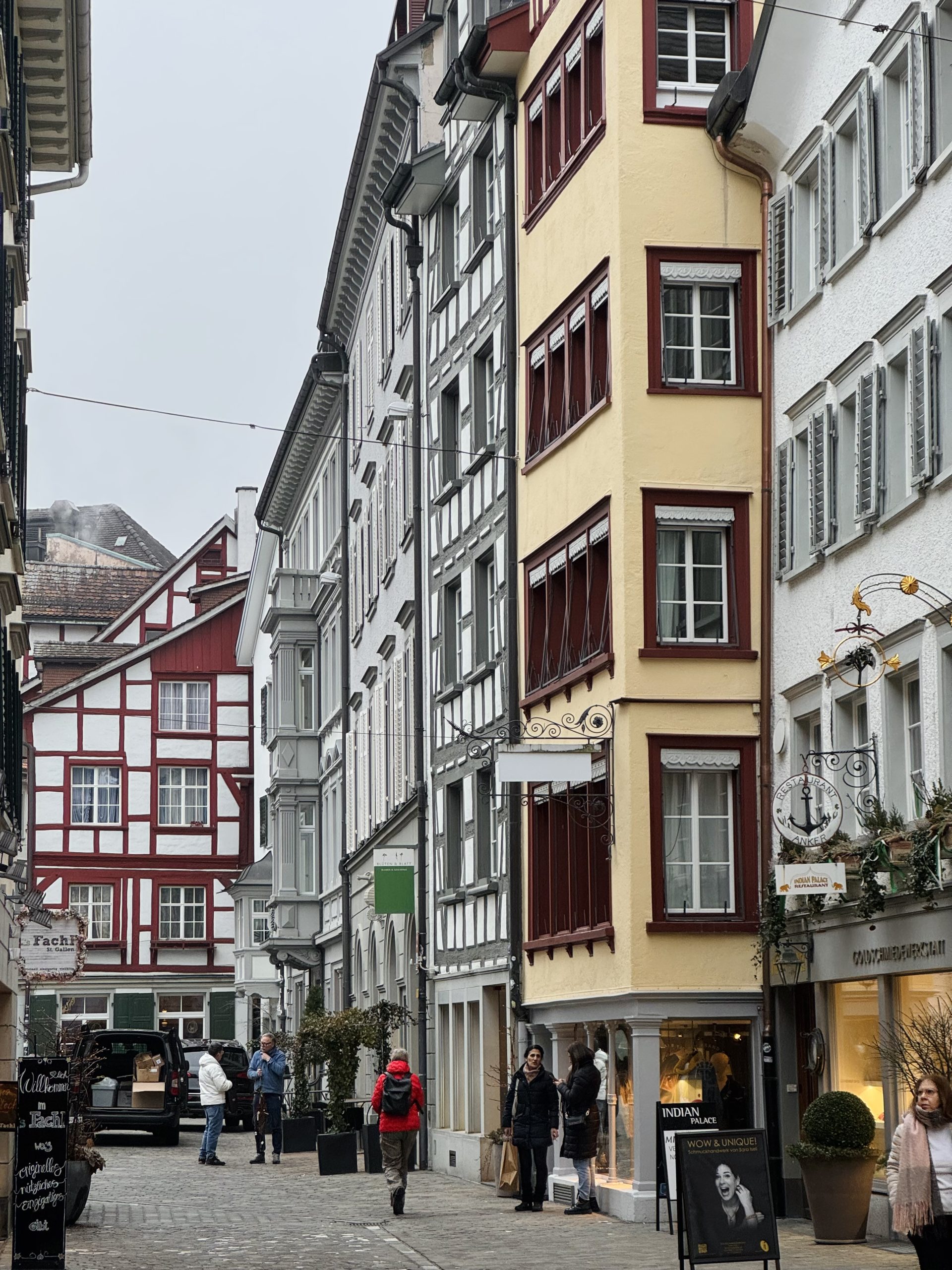 The walk from the station into any new town or city is always the worst way to form an opinion. First impressions of St Gallen were: modern, commercial, smart, full of banks. No snow left at street level except on some grassed areas, so back to walking on easy pavements again. Within 10 minutes’ walk we crossed the tram lines and headed into the city centre. Immediate change. Colourful half-timbered houses, intricate bay windows, colourised shutters – smart fronts, quirky, crooked backs and twisted alleys of cobbled streets. So different from any architecture we’ve seen so far on this trip. At pavement level, cafes, small shops – a smart, enticing town.