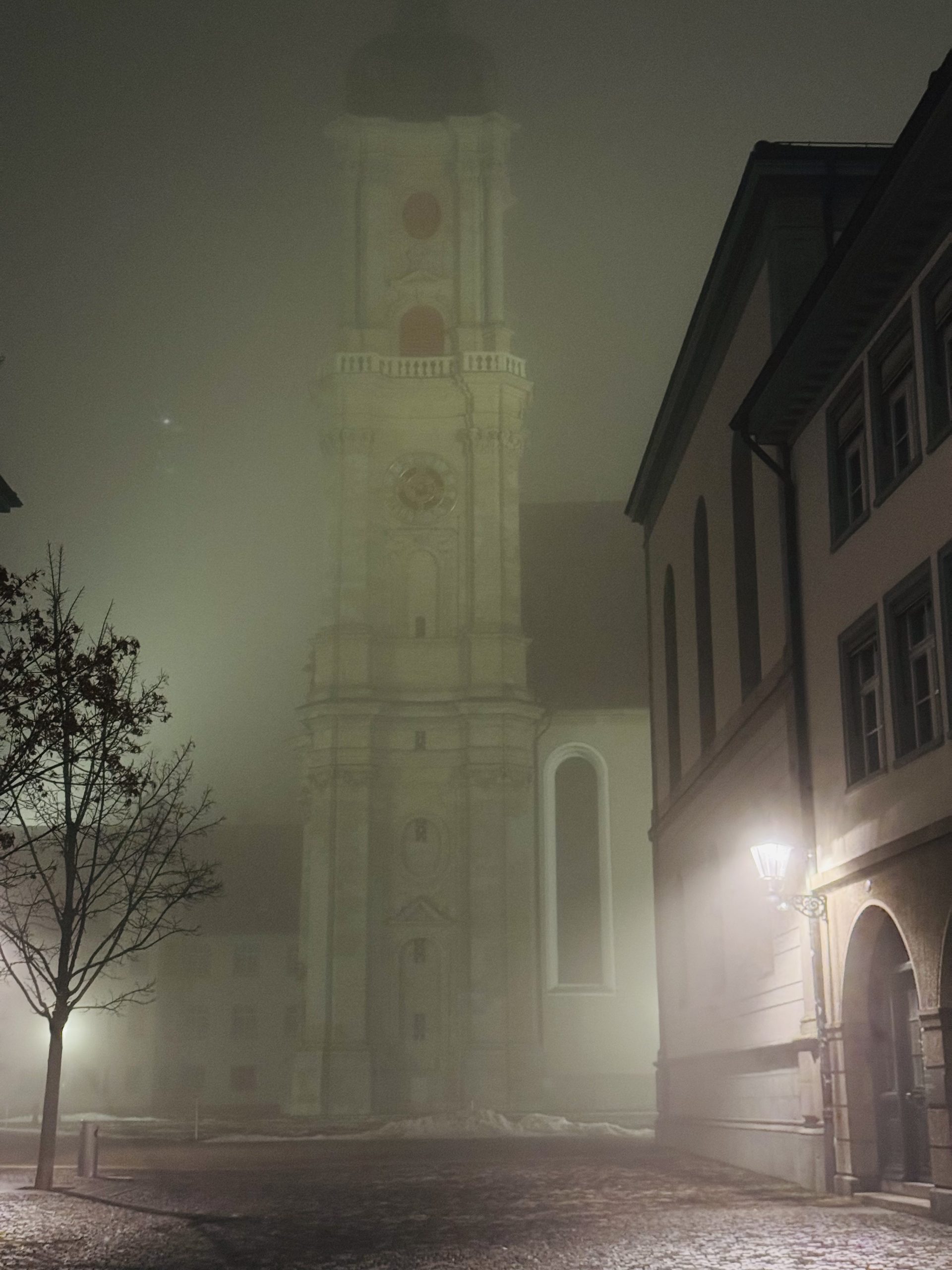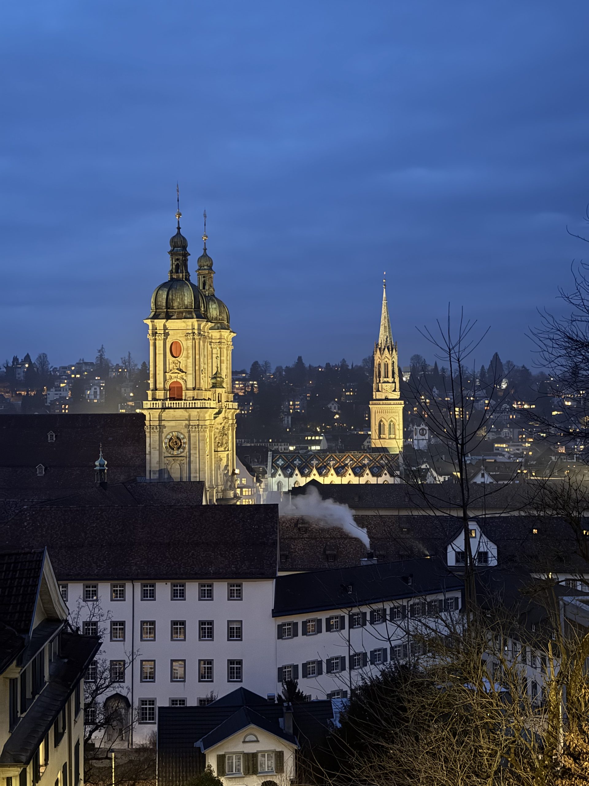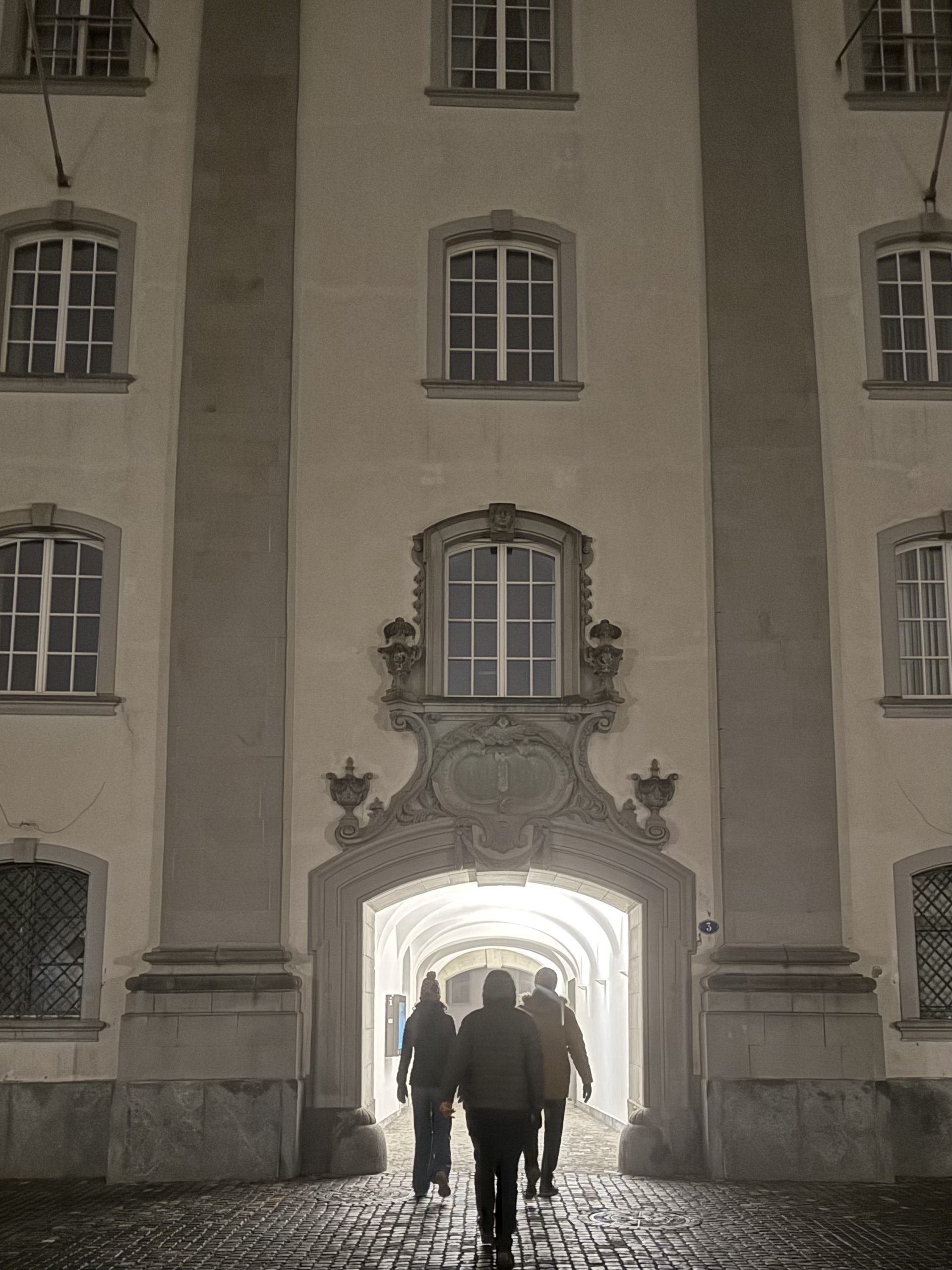 After dinner we headed out to walk off (some of) the cheese. A thick mist was blanketing St Gallen and the city felt wrapped in mystery. The cathedral – no longer visible from a distance, then emerging from the mist as we approached as though only half there. The spotlights in the abbey square cutting through the mist, casting a light that was at once beautiful and a little eerie. I always love the way mist strips all the detail from a scene, taking it back to its most fundamental elements: ground, horizon, trees. In a city it wraps everything in a sense of secrecy and intimacy, and St Gallen on a misty night felt timeless and a little unreal.