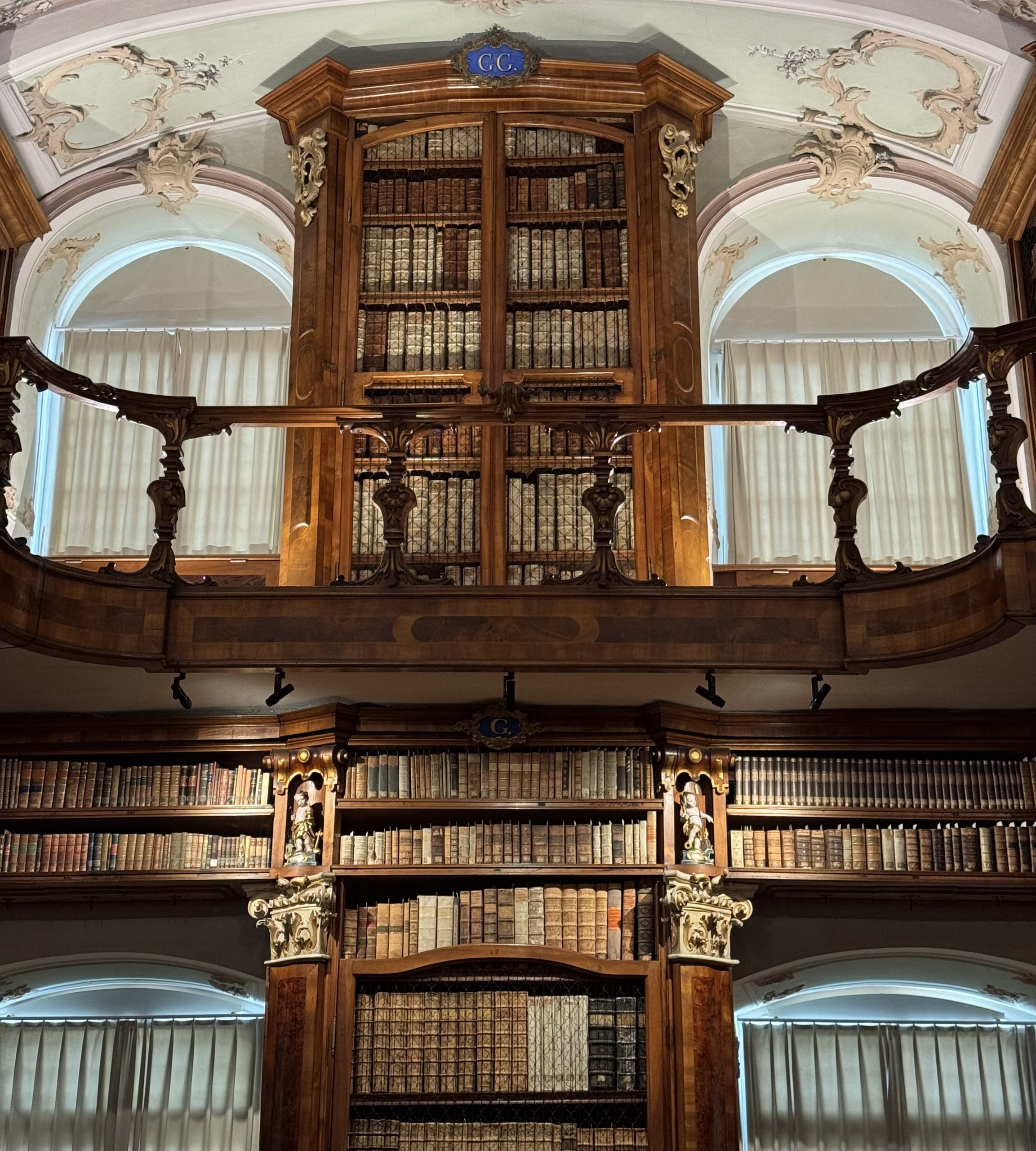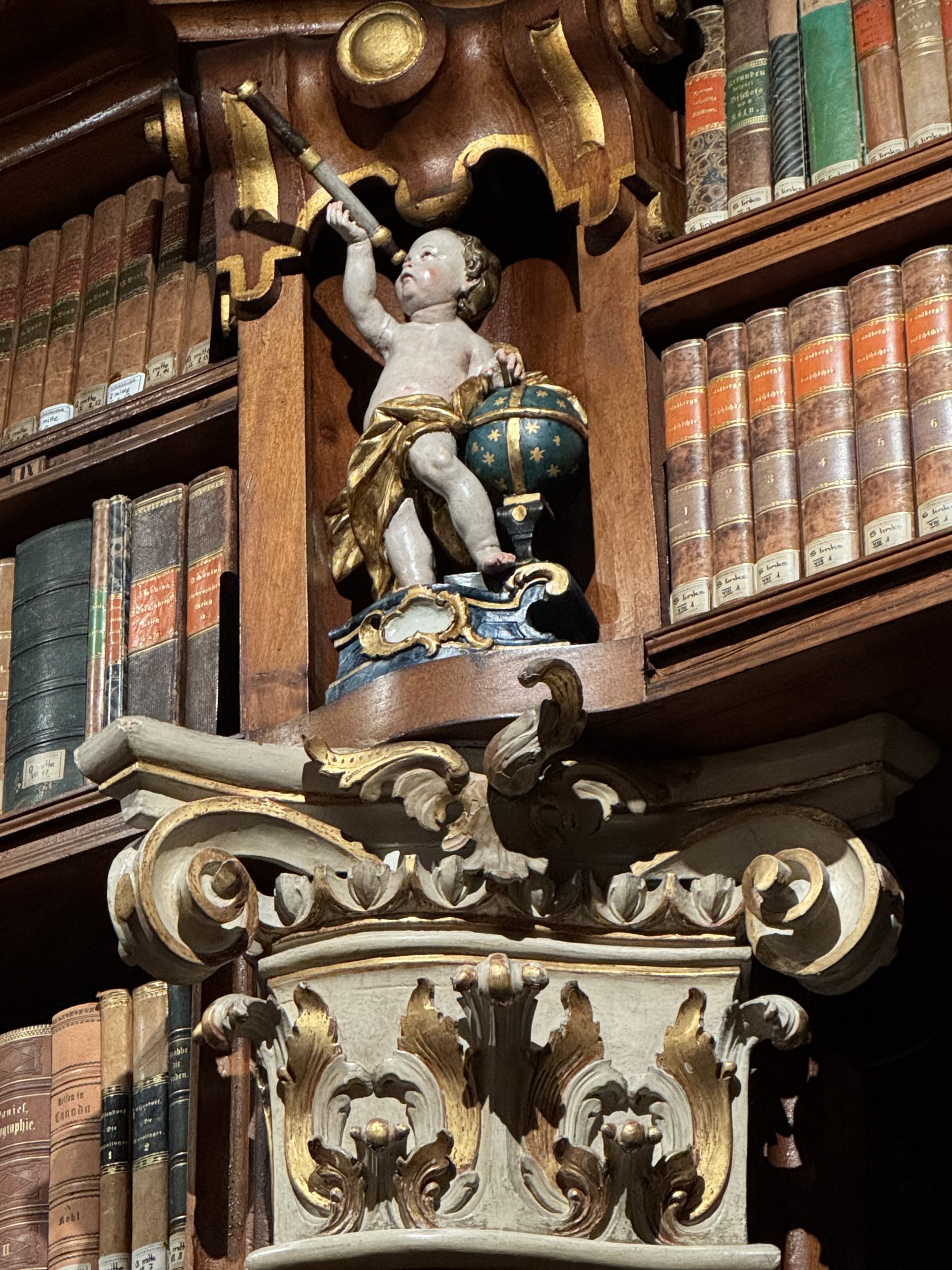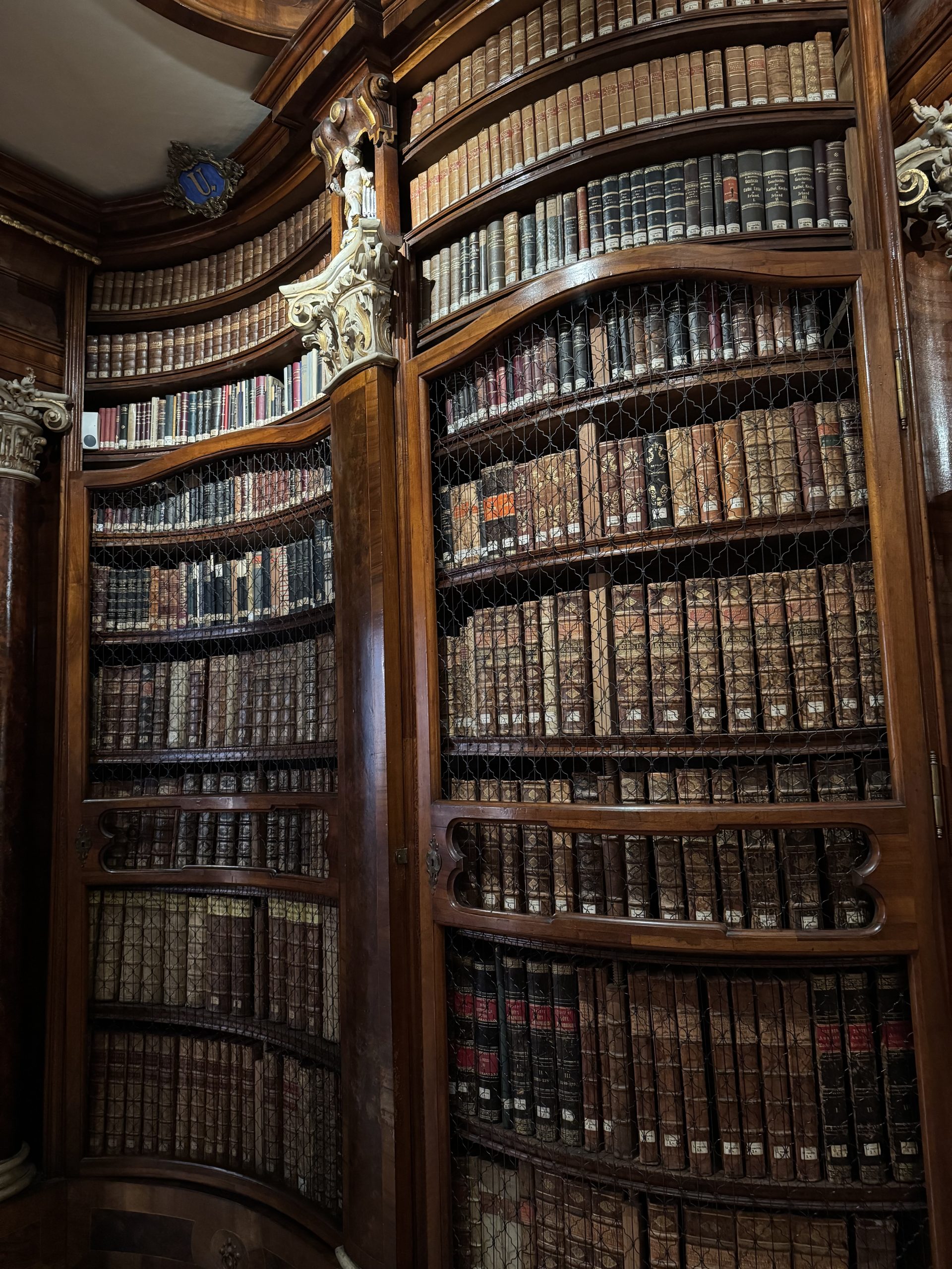 I tried to take in the details one at a time to make sense of everything we were seeing. Intricately carved, polished wooden shelves stretched from floor, up to high balconies, where even more books reached the ceiling. A thousand intricate details – every corner, curved shelf and railing was ornate, carved, decorated. Cherubs, gilt edgings, ornate plaques with gold lettering showing the alphabetical cataloguing of the books.