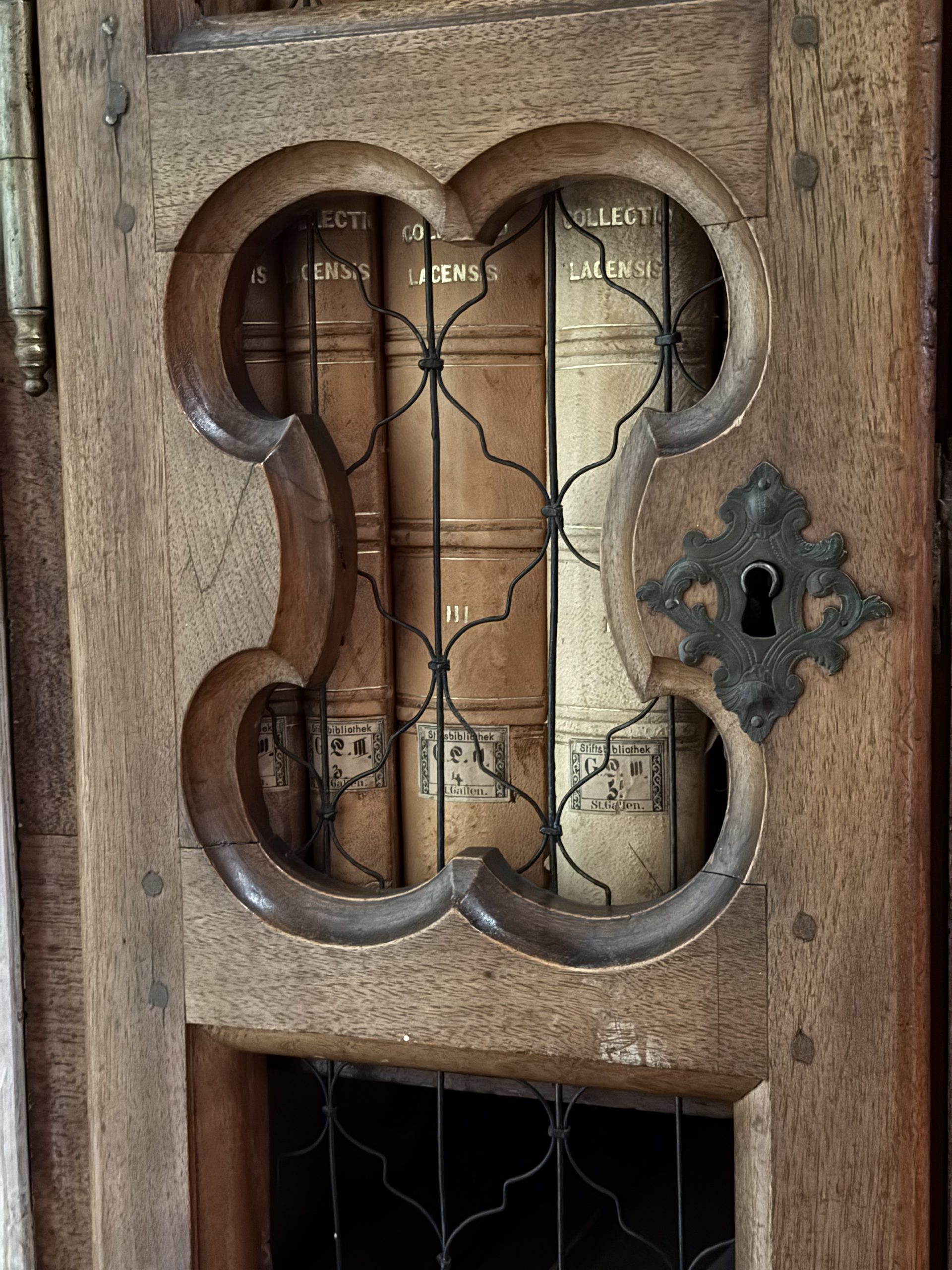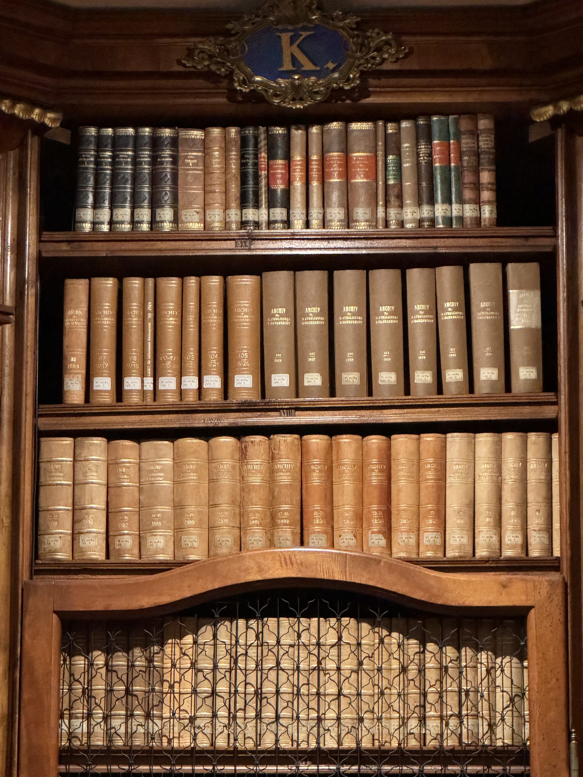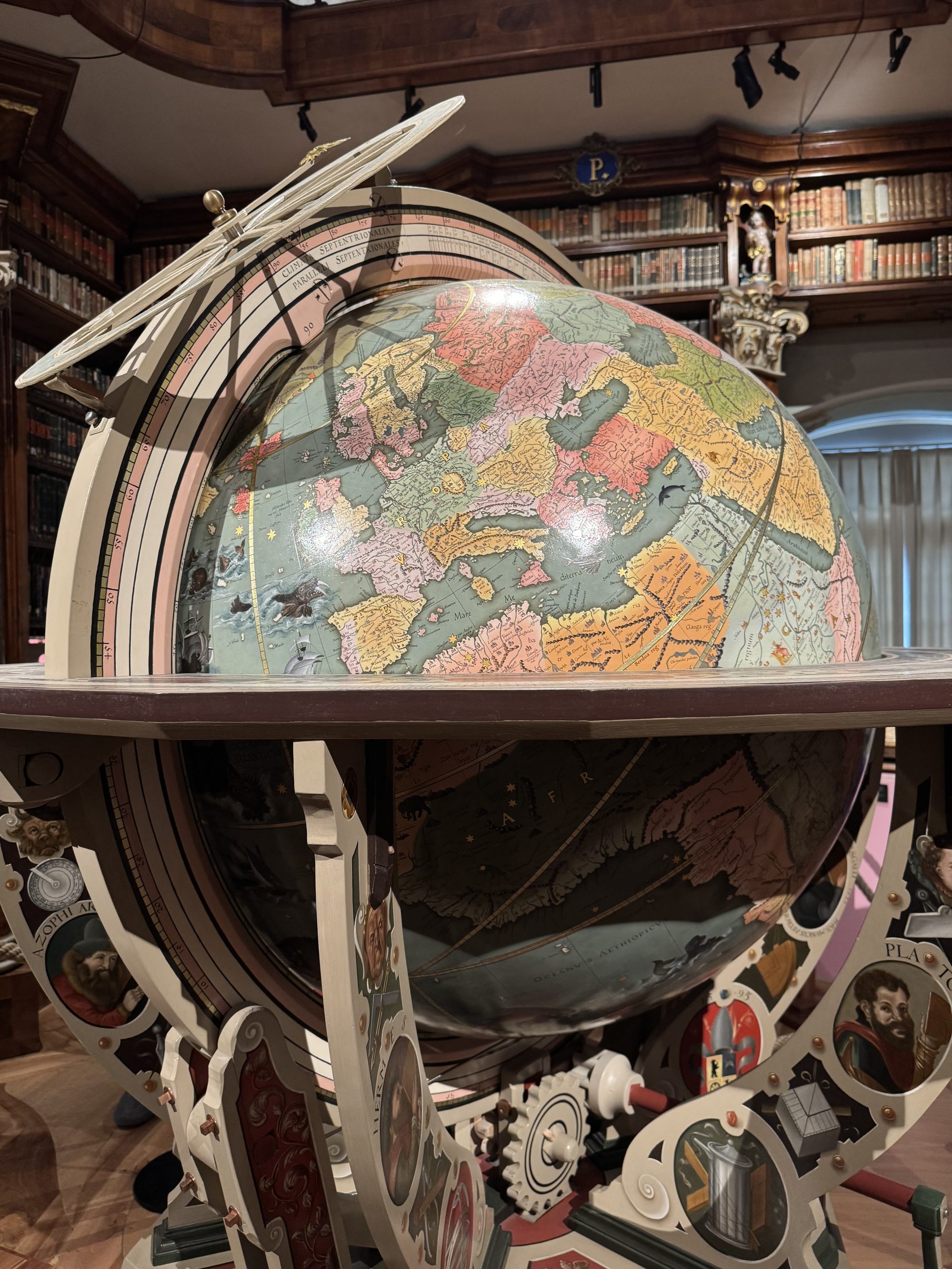 I tried to take in the details one at a time to make sense of everything we were seeing. Intricately carved, polished wooden shelves stretched from floor, up to high balconies, where even more books reached the ceiling. A thousand intricate details – every corner, curved shelf and railing was ornate, carved, decorated. Cherubs, gilt edgings, ornate plaques with gold lettering showing the alphabetical cataloguing of the books.