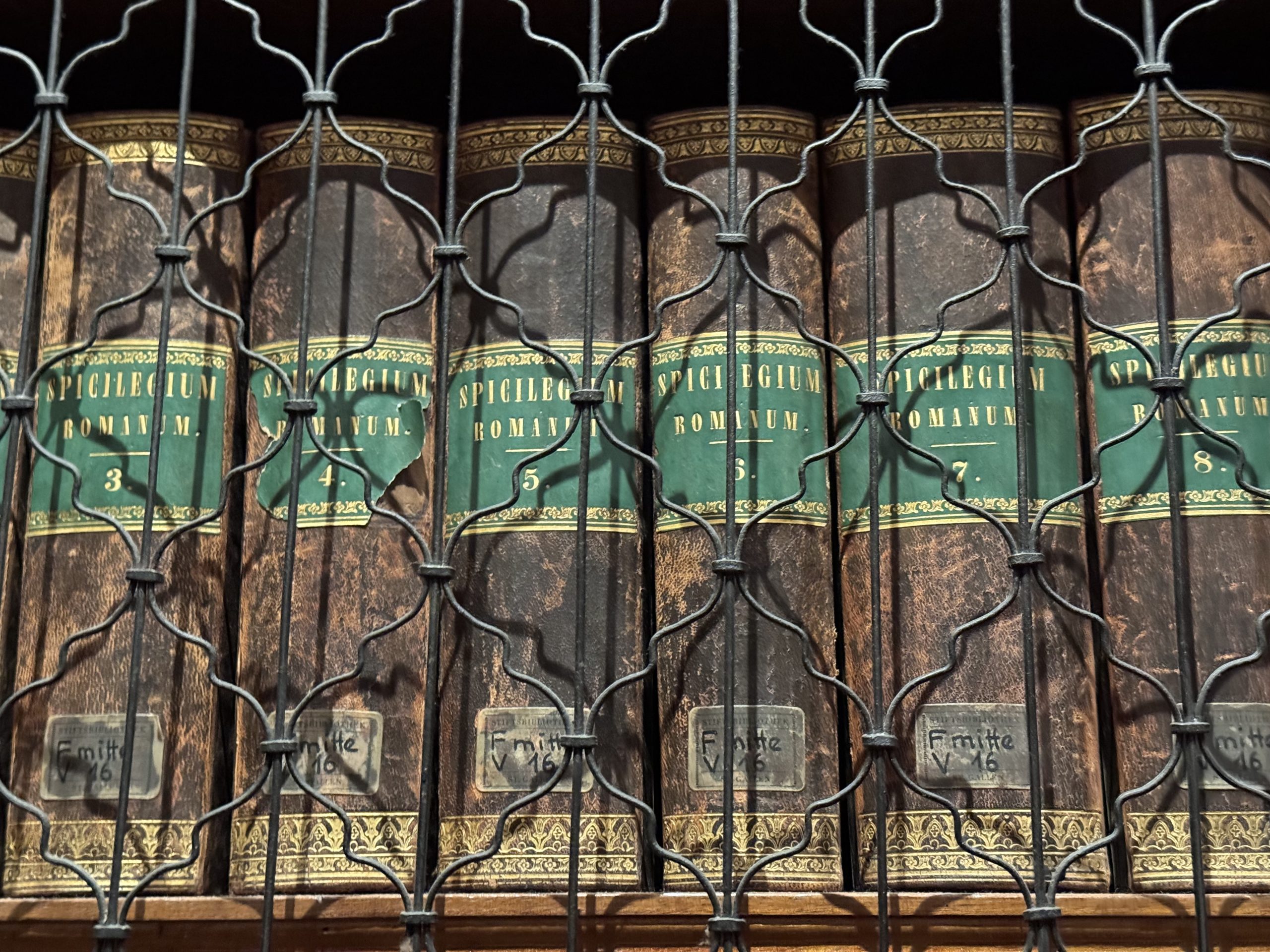 After the exhibition, the main event: the library. To get there, we walked back across the courtyard and through the arch into the middle of the cloisters. Remember that statue from last night? Well, it turns out that in the daylight, he wasn’t looking out at us. He’s looking down at a book. Trick of the light, a moment in the mist? Who knows – I’m not going back after dark!