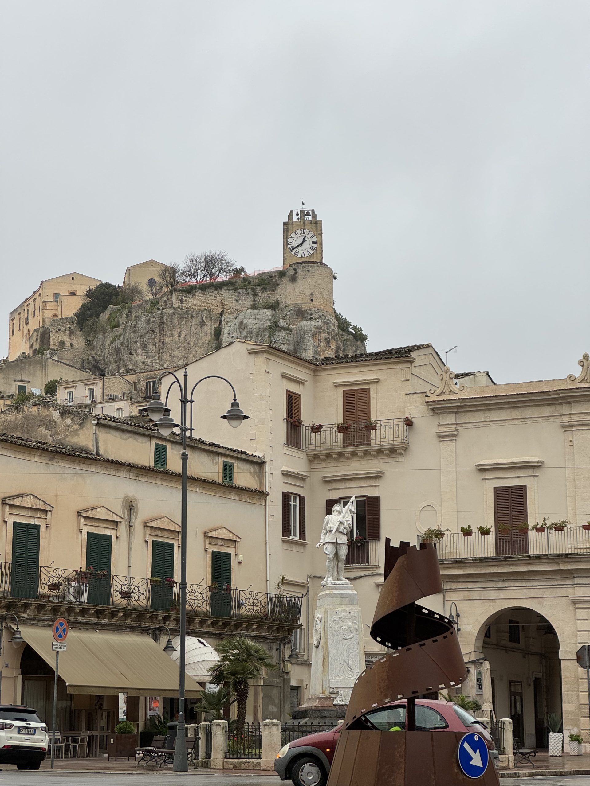 Should we stay overnight in Pozzallo? (A resounding no – it’s pretty much closed in January). Could we find somewhere open for a long and lazy lunch (see above, no). Could we see a museum or get a coffee or take a walk (nope, nope, raining). Could we find a bus to take us on somewhere else? (You guessed it: no buses). Brainwave. Let’s get a taxi to Noto, a beautiful baroque city I’ve always wanted to see. Minimum taxi charge €80. Gulp. Do we just skip Pozzallo? It’s an arbitrary point in the map, it’s barely further south than Syracuse or Noto. Really, do we need to see this arbitrary end point of an arbitrary route we created ourselves? Well, actually – yes.