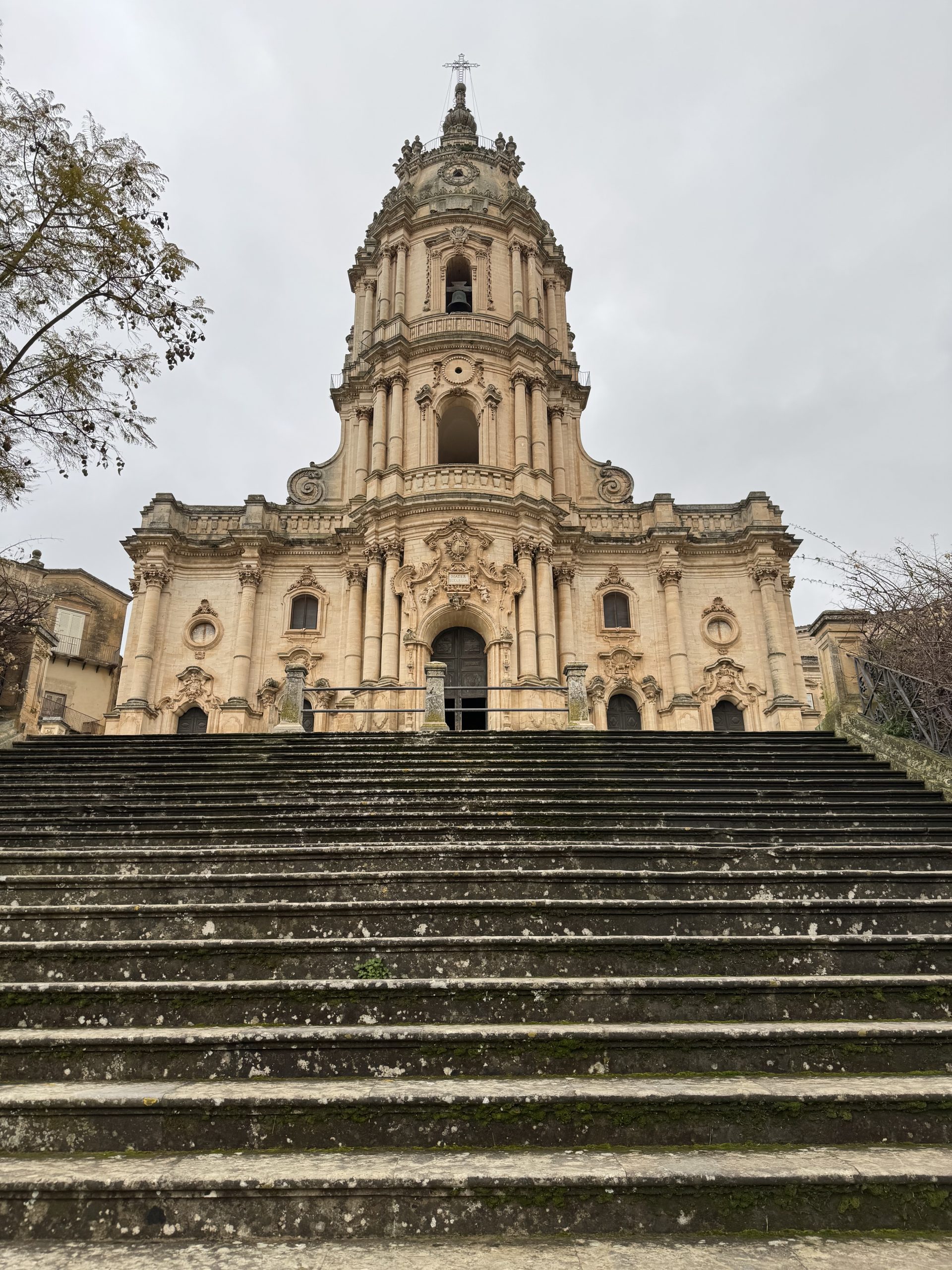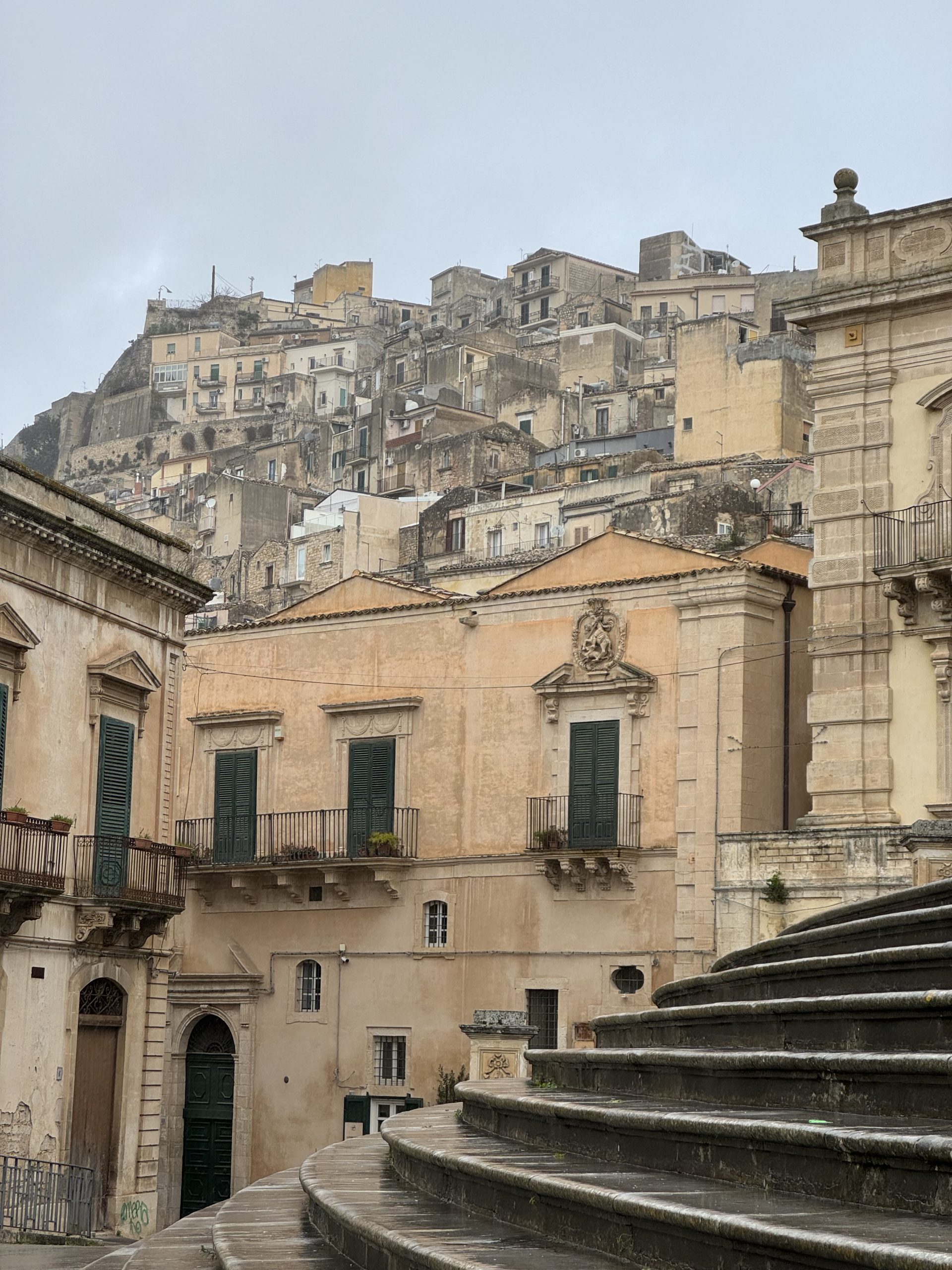 Modica, even in the rain, was stunning, and my overcast photos don’t do it justice. Full of stunning baroque buildings, incredibly grand and smart – churches and clock towers and castles all towering above on the hill. We wound up a narrow street and then found a grand set of steps leading stunningly up to the cathedral, sitting proud and imposing at the top.
