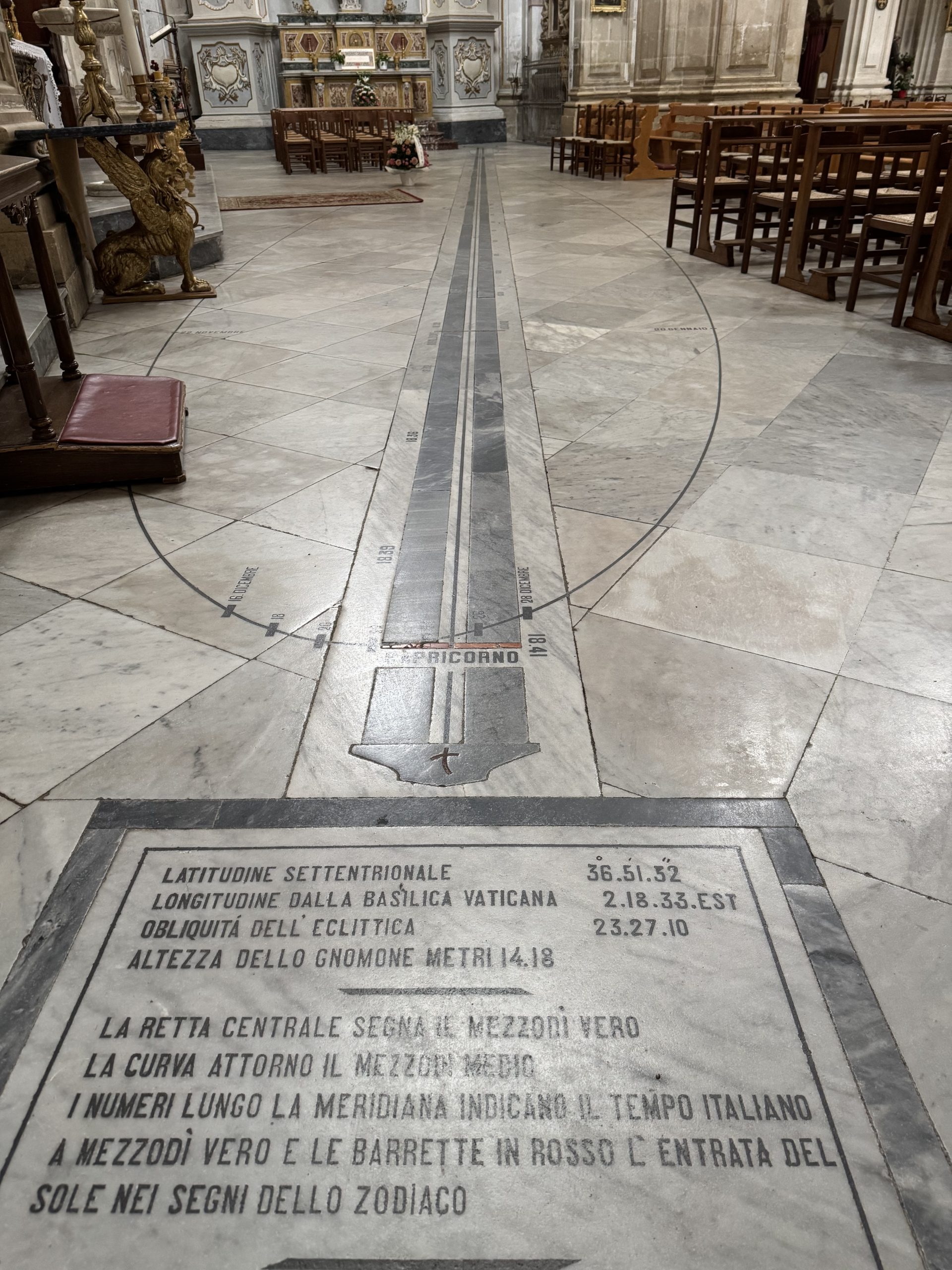 The cathedral (described as ‘among the seven wonders of the baroque world’) was open, free to enter – and stunningly beautiful. Ornate ceiling and altar, a gorgeous organ. Artworks and relics. In front of the altar, a floor sundial from 1895, using the movement of a shaft of light at noon to track the progress of the year, the star signs and more. Very clever, if sadly not visible on a rainy day.