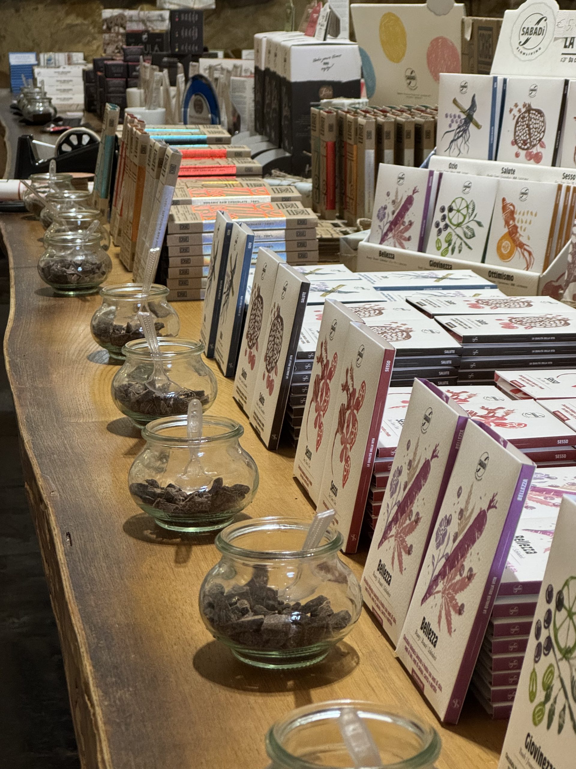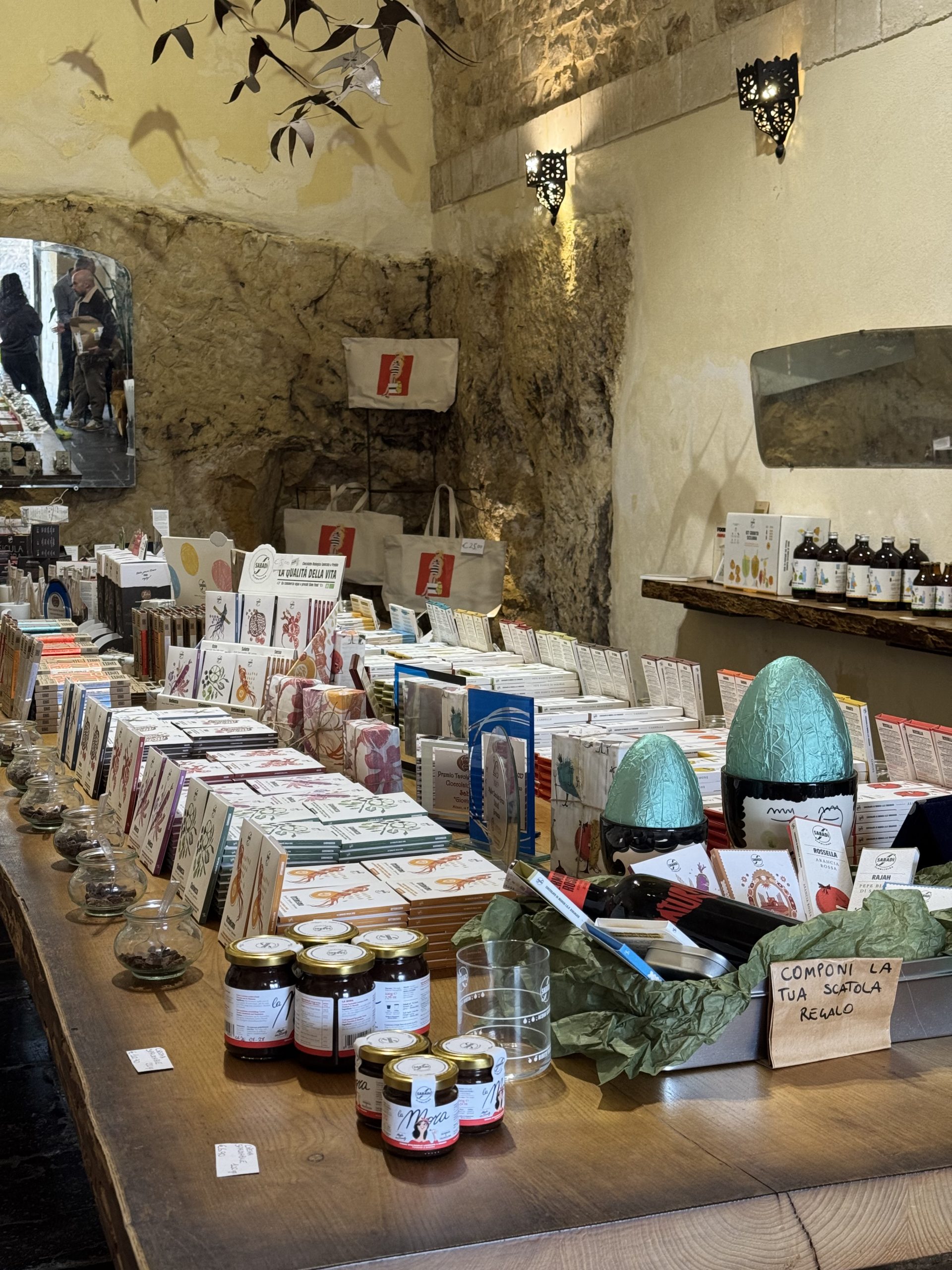 Sabadi’s shop was beautiful. A high arched ceiling, decorated with steel birds. In the centre, a long table full of chocolate. We were welcomed warmly, introduced to Modica chocolate, and invited to take our time tasting as much as we wanted.