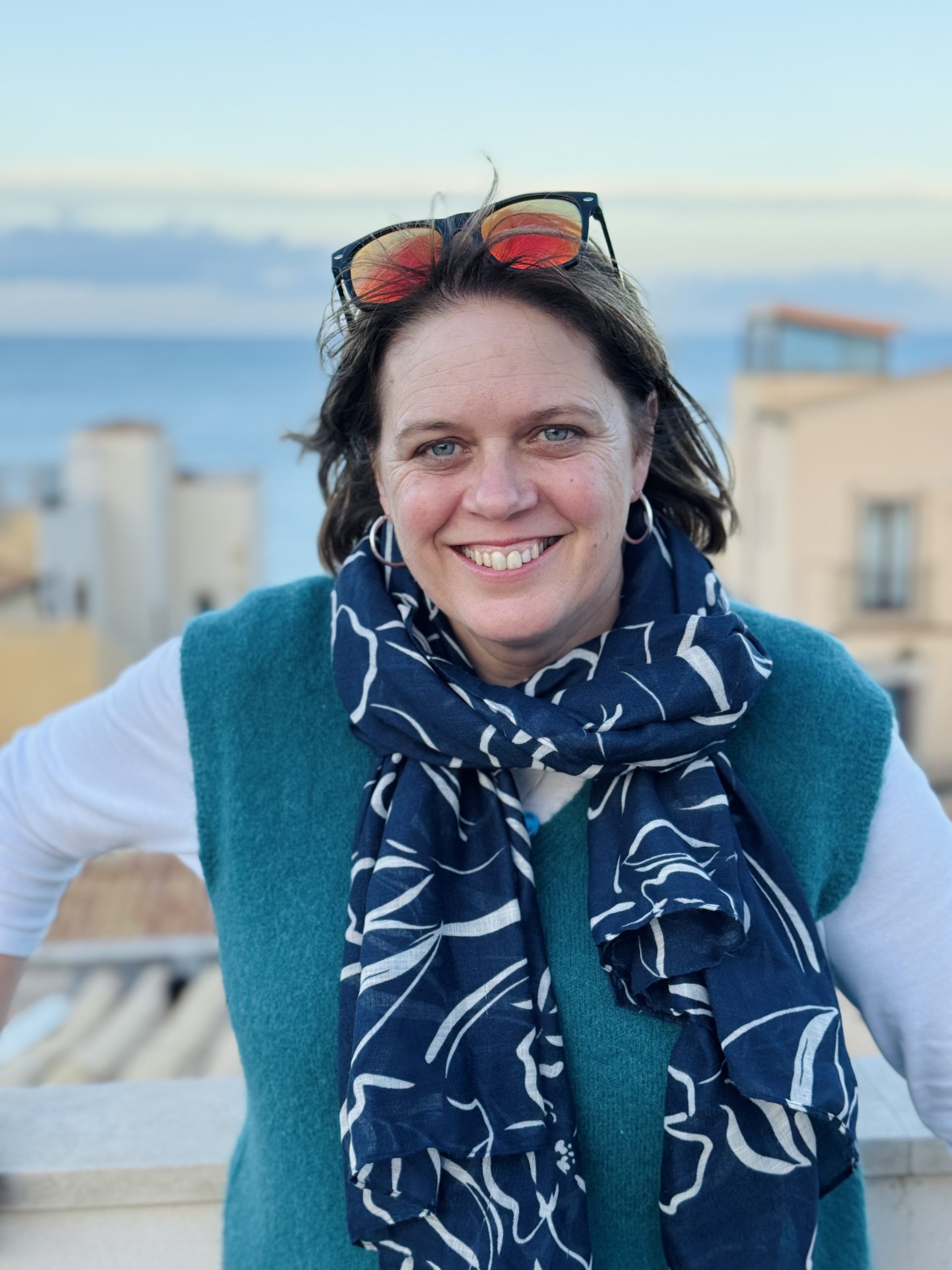 Our apartment – through another fantastic big wooden door, the last of the trip. An inner courtyard, some steps, an iron gate, some more steps … and then behind a door, a gorgeous modern living room and smart kitchen. Up more steps to a bedroom in the eaves. And then up more steps to a terrace, seemingly suspended in the sky among the roofs. Sun-bleached terracotta roof tiles on all sides, chimneys and aerials and church towers. Shuttered windows and balconies with flowers. On three sides, views out to the ocean. Absolute heaven, and what a place to finish this trip.