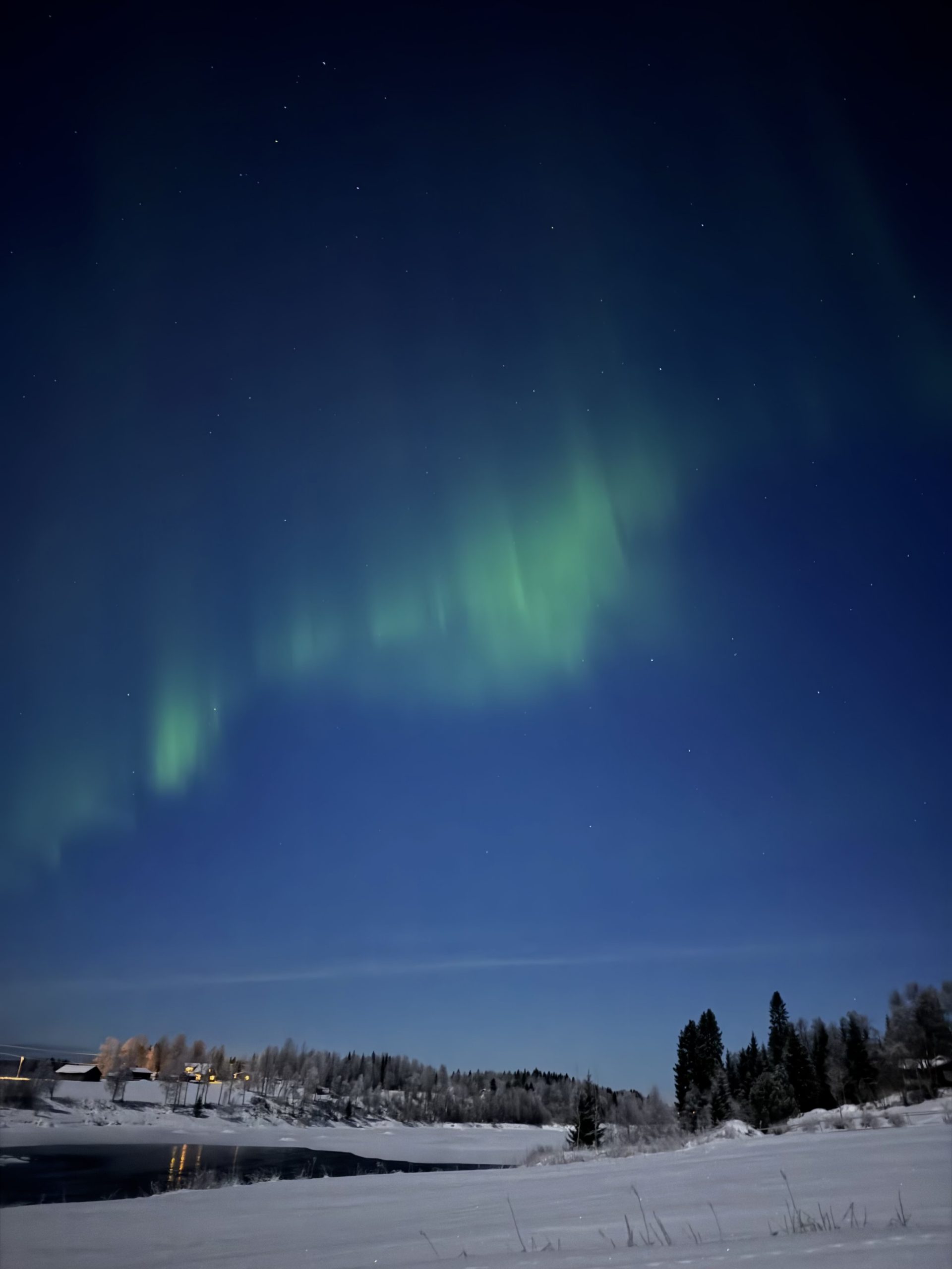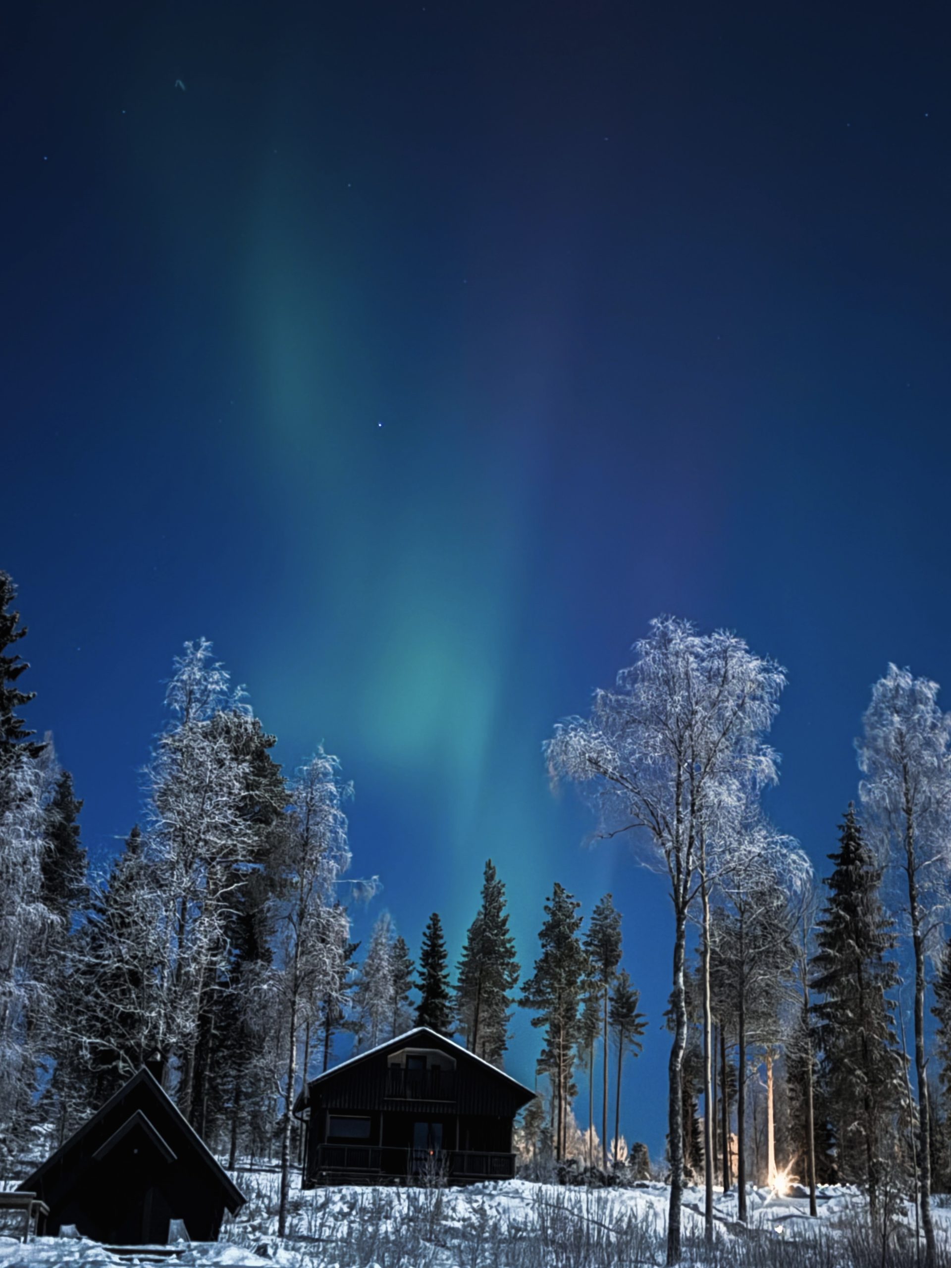Walking back to the cabin, we spotted a green haze beyond the trees, and soon the sky was dancing with light – fully vibrant green to the naked eye this time, even under the light of a full moon. It was genuinely magical – frozen trees, snowy ground, our little cabin and the other-worldly dancing lights.