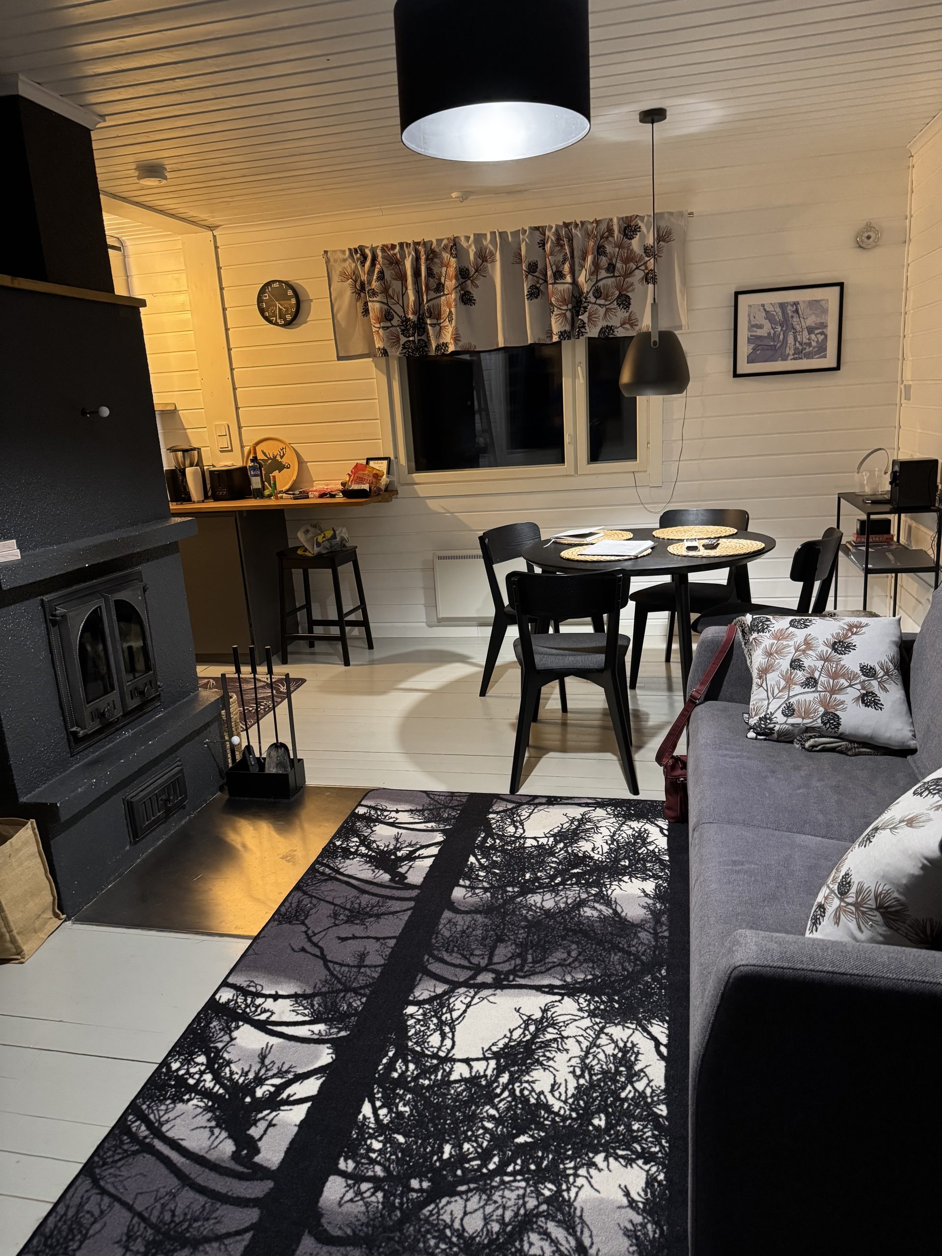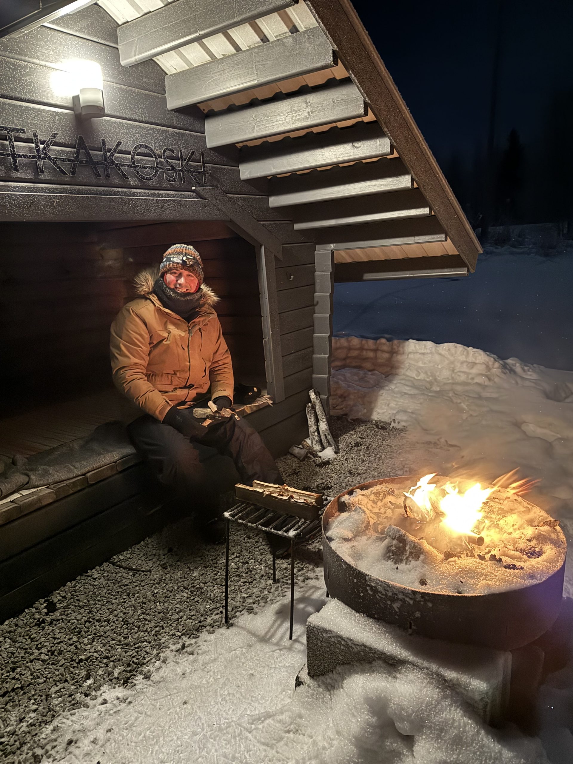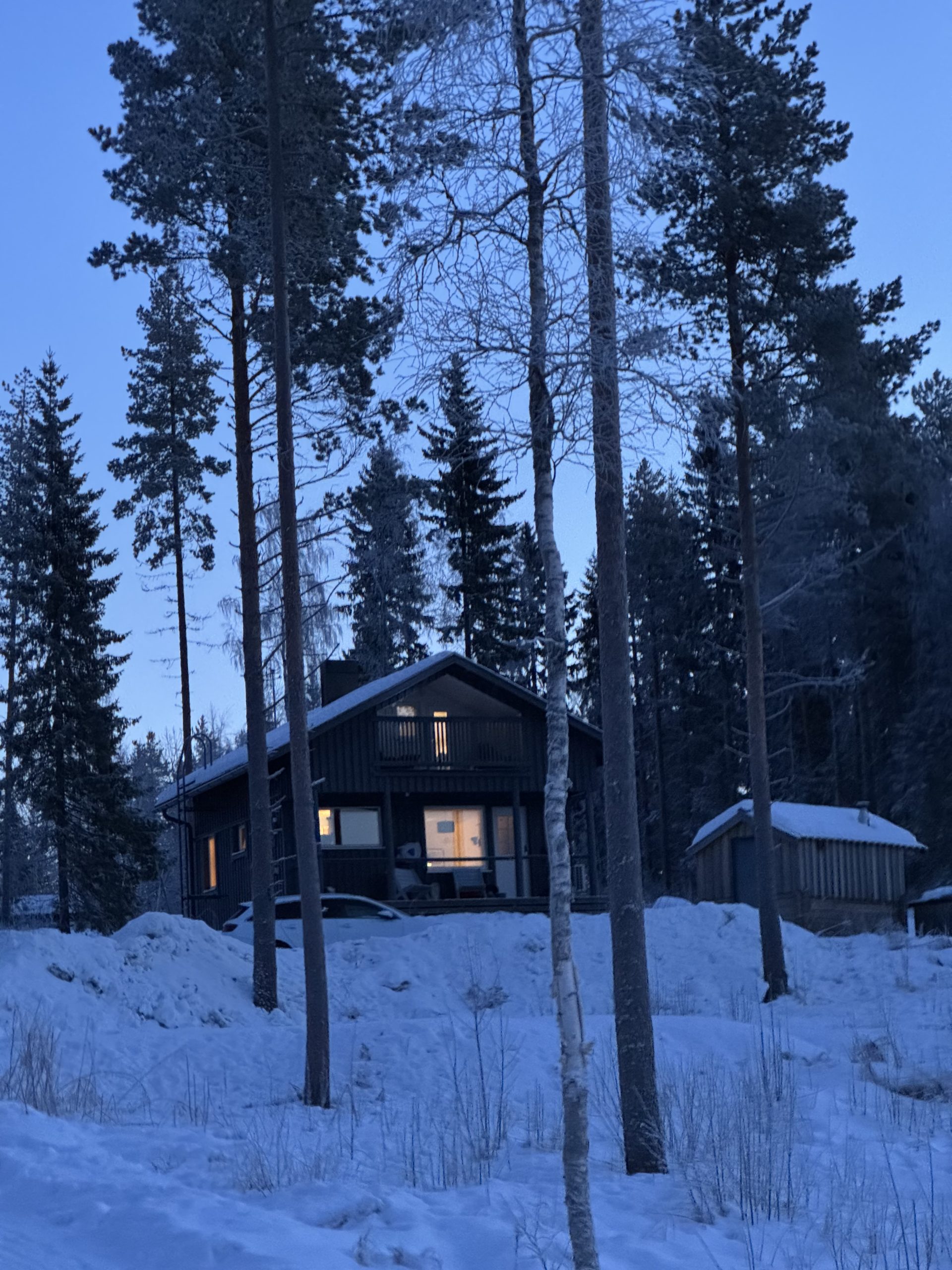 The cabin is … idyllic. It’s everything we could have hoped for and has been a joy for two lovely days. Tucked in the woods, surrounded by snow, with views down to the rapids on the Torne river, and then across into Sweden. A big fireplace, cosy living space and cute bedroom up a steep ladder. And, this being Finland, our own perfect little sauna attached to the shower room (fun fact: Finland has more saunas than cars. Sauna use is a huge part of their culture, for both health and socialising).
