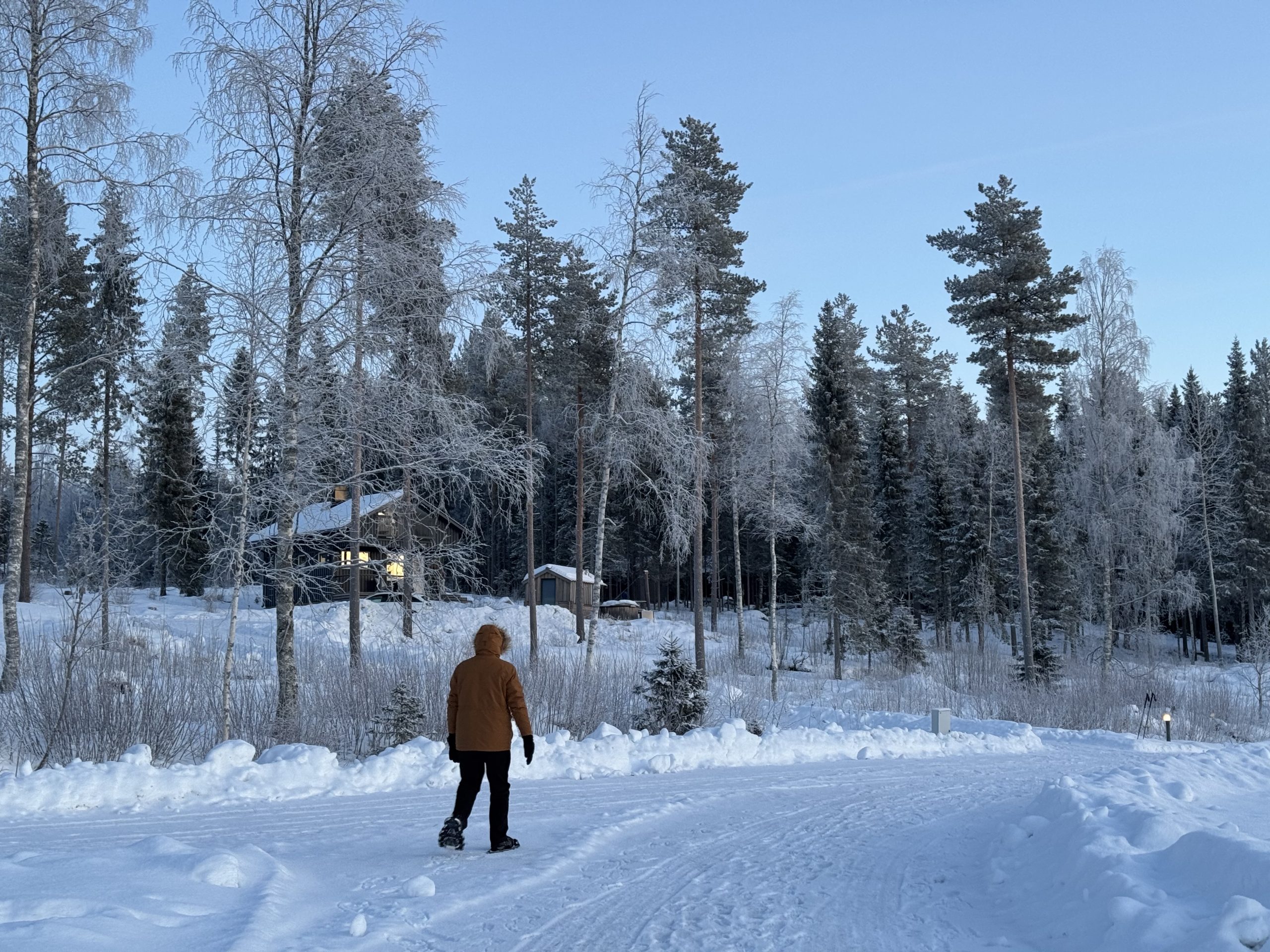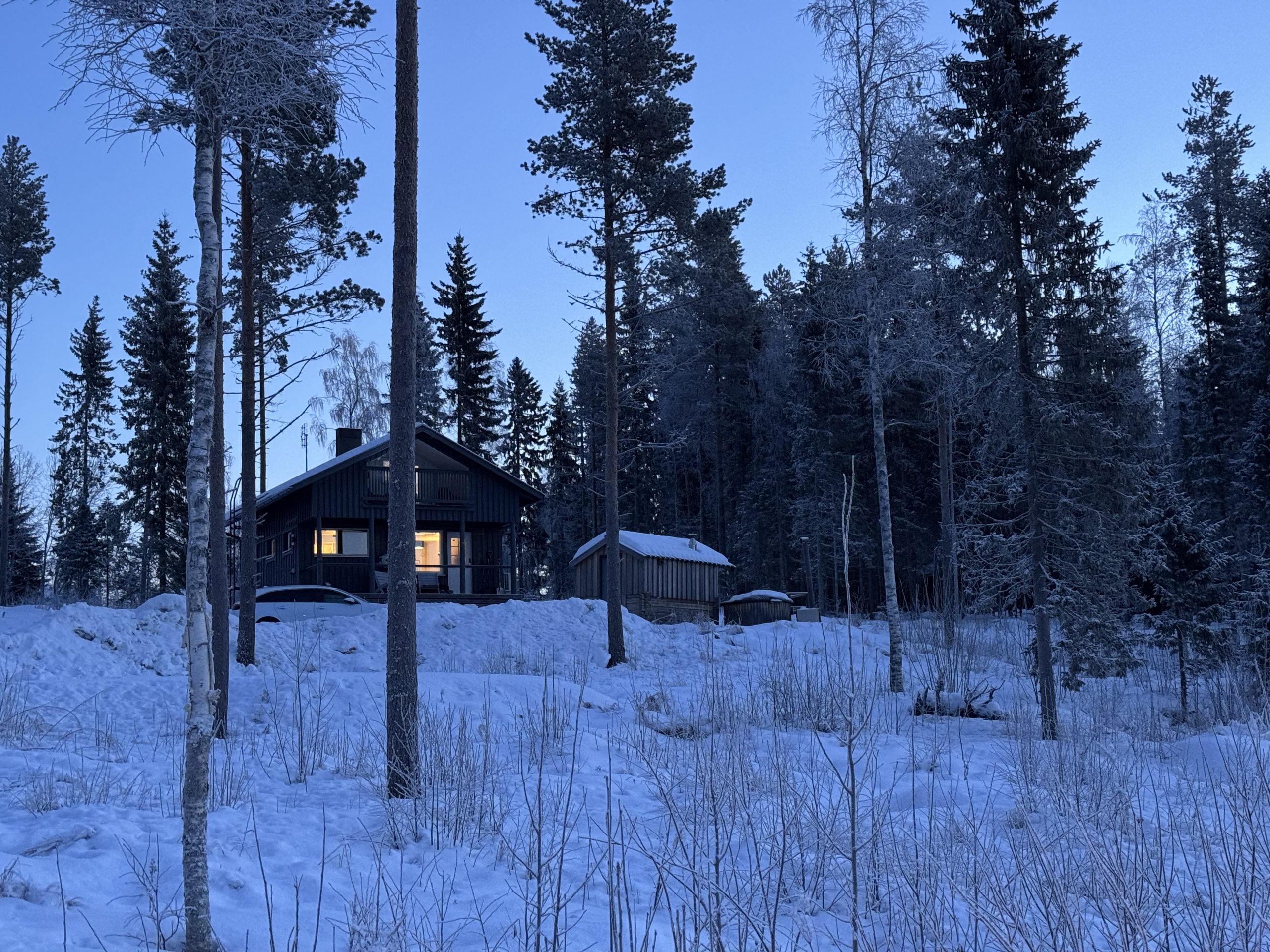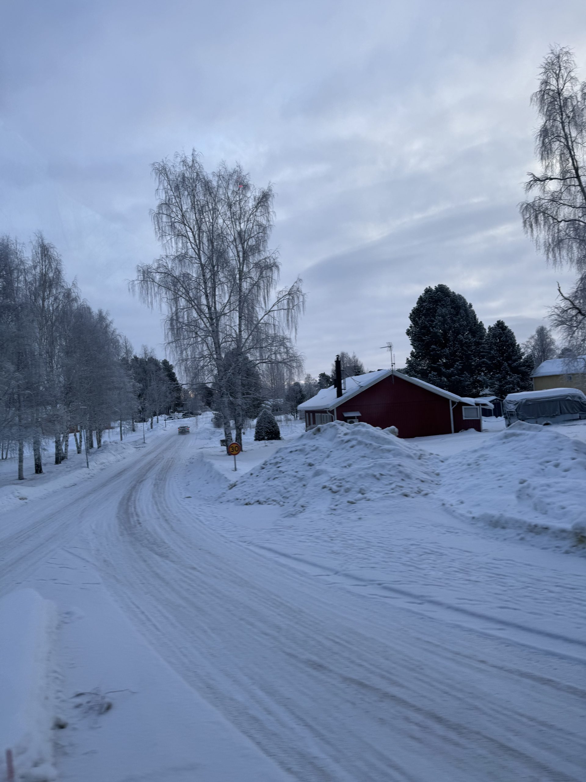 The cabin is … idyllic. It’s everything we could have hoped for and has been a joy for two lovely days. Tucked in the woods, surrounded by snow, with views down to the rapids on the Torne river, and then across into Sweden. A big fireplace, cosy living space and cute bedroom up a steep ladder. And, this being Finland, our own perfect little sauna attached to the shower room (fun fact: Finland has more saunas than cars. Sauna use is a huge part of their culture, for both health and socialising).