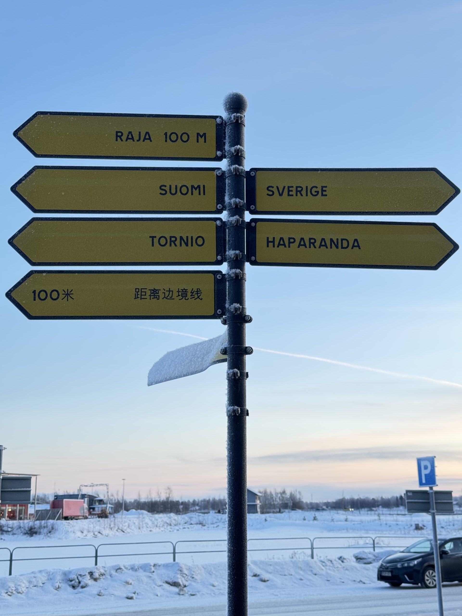 The bus took us as far as Haparanda, on the Swedish side of the Torne river, which marks the border with Finland. Haparanda is home to the world’s most northerly IKEA, which I’m sorry to report we did not visit – no room in the rucksacks for meatballs. Leaving the bus station, turning right means staying in Sweden. Turning left hops you across a bridge to Finland, seamlessly changing both country and timezone.