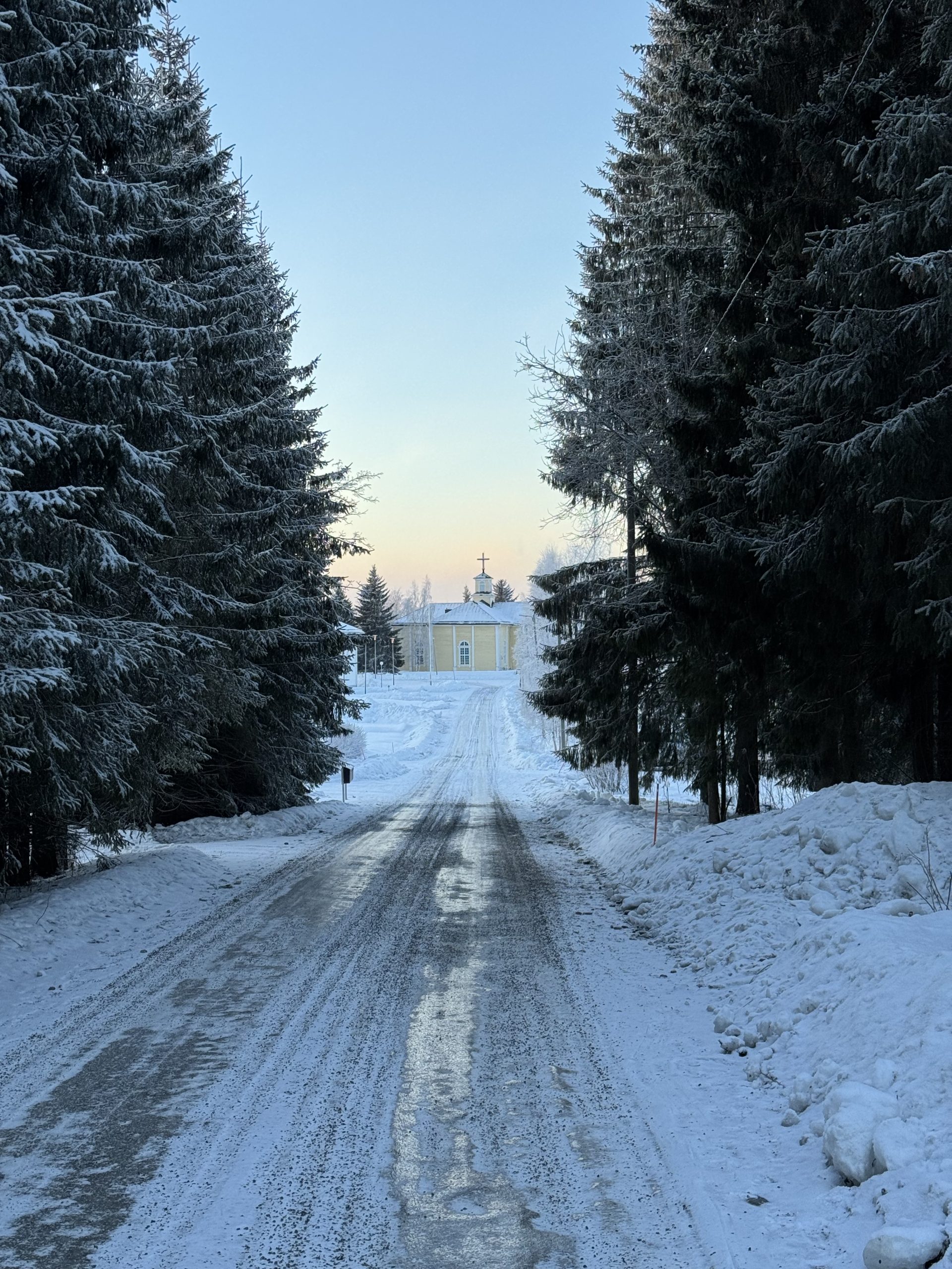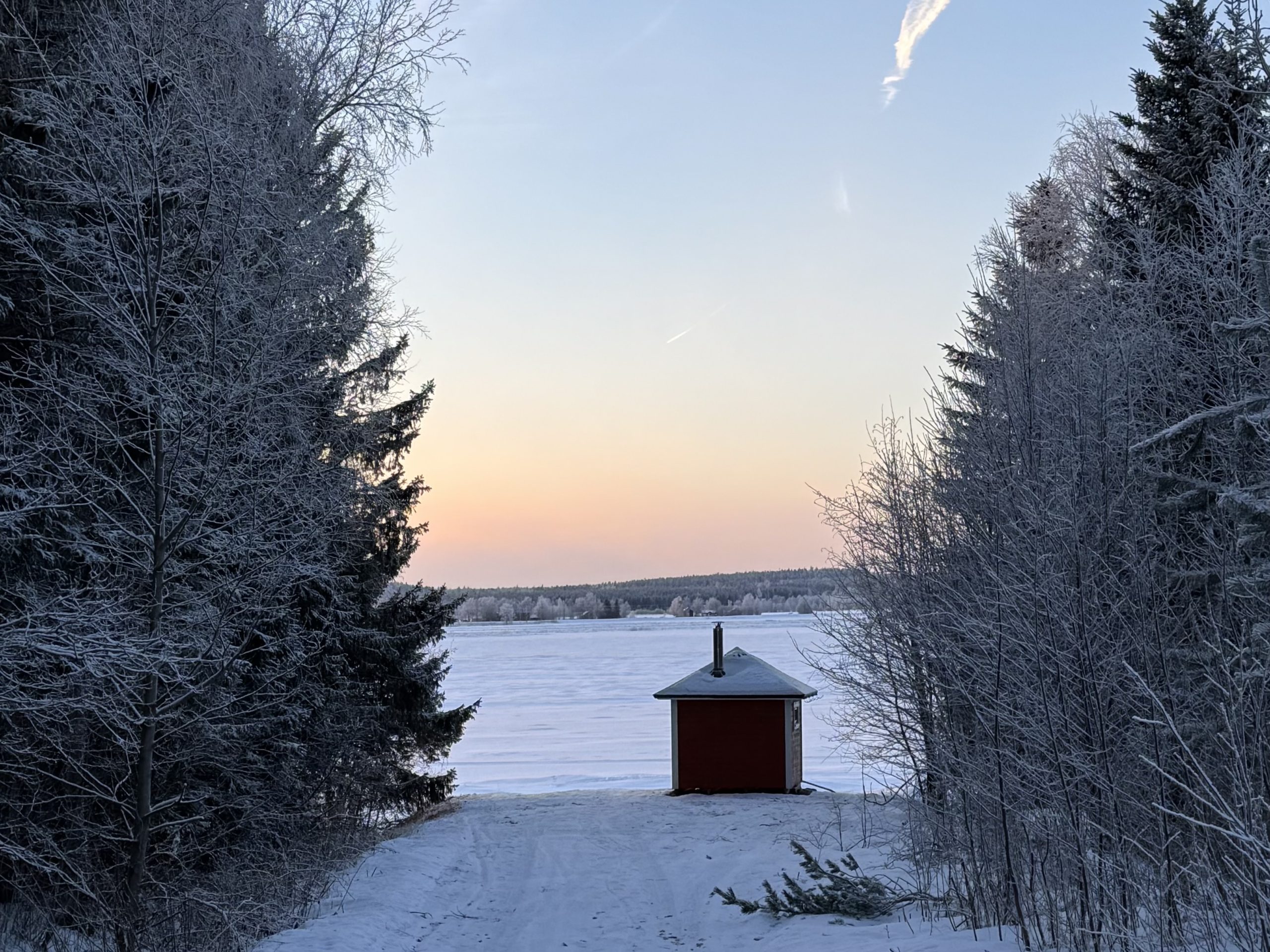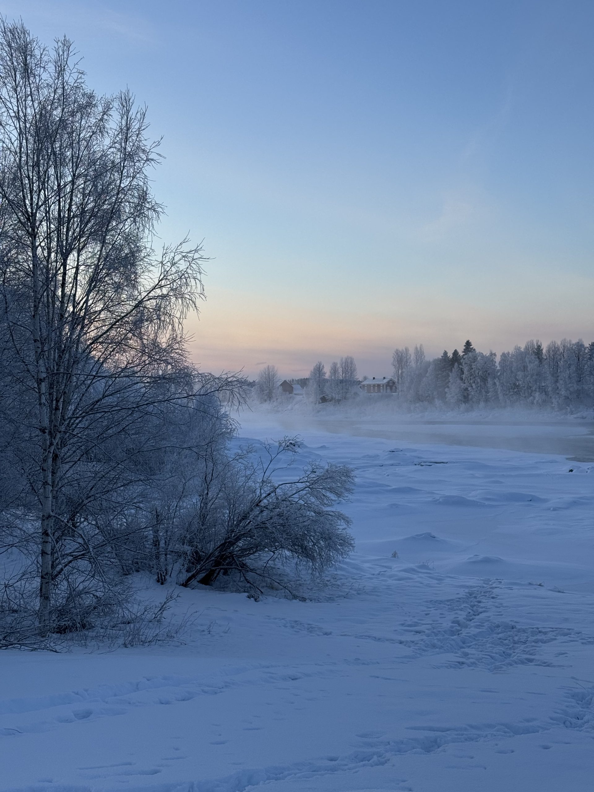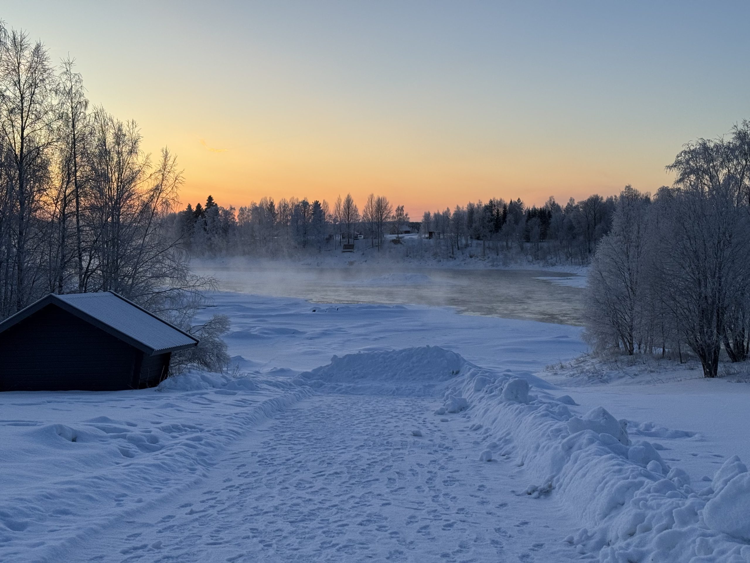 On Sirpa’s recommendation, we took a crunchy walk through the snowy village streets, past a beautiful pastel-yellow church and down to a hut beside the river (frozen here, away from the rapids, with the setting sun painting warm colours onto the ice).